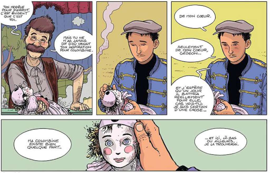 On quitte alors le Paris historique voire sociologique pour plonger allégrement dans la romance et la fantaisie. Le livre est dédié à Michel Legrand, le compositeur des « Demoiselles de Rochefort » et l’ombre de Jacques Demy plane bien sur l’intrigue et le dessin… A l’instar de Camille qui a vu Valentine dans ses rêves et l’a sculptée en Colombine pour son ami marionnettiste, le peintre Maxence a peint son idéal féminin sans la connaître et ne rencontre Delphine que dans les dernières secondes du film alors qu’ils n’ont cessé de se croiser.