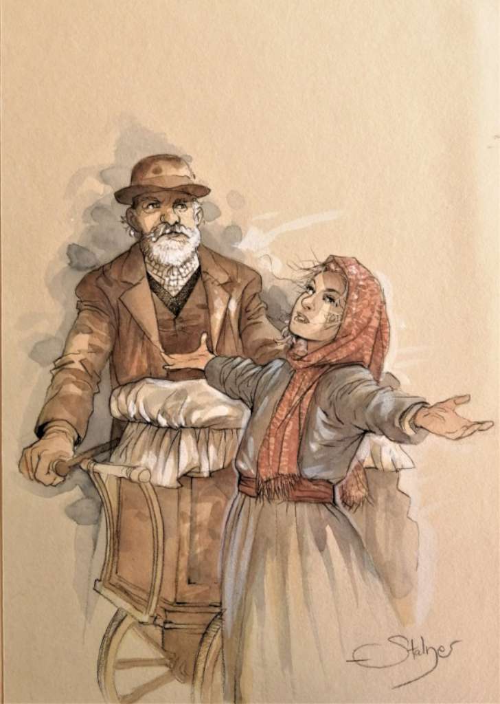 A l’origine, on trouve une photographie d’Eugène Atget, un peintre documentaire reconnu désormais qui faisait œuvre de sociologue malgré lui en immortalisant pour des peintres les quartiers, les rues et les métiers voués à disparaître. Dans son préambule, Stalner explique comment il a été frappé par cette photo intitulée « Joueur d’orgue de barbarie » et ému par la petite fille au regard lumineux et au sourire radieux qui s’y trouvait au premier plan. Il met en scène cette inspiration en en faisant la première case de l’album : on y voit une reproduction de la célèbre photo de 1898 et celle-ci est ensuite reprise sous forme de dessin où l’on aperçoit au premier plan le photographe en train de prendre son fameux cliché. Eugénie, qui emprunte son prénom au photographe comme un clin d’œil, l’héroïne éponyme de l’album, s’anime ainsi sous nos yeux et nous entraîne dans ses aventures.
