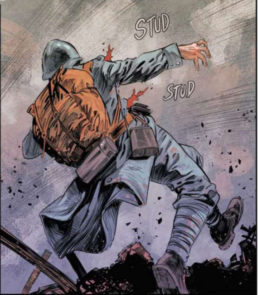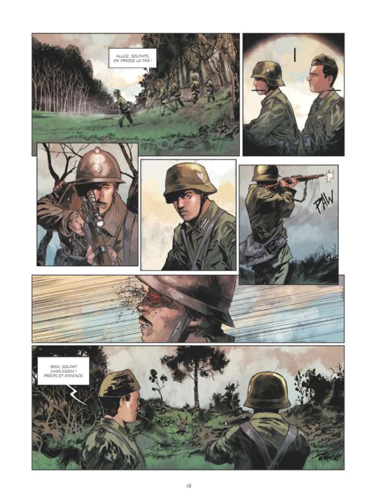 Donc, même s’il s’agit d’un tome introductif, on y trouve un suspense habilement mené et une mise en place dynamique des arcs narratifs. L’ensemble est vraiment mis en valeur par le dessin magnifique d’Aurélien Morinière qui commença par travailler dans l’animation avant de se tourner vers la peinture et la bande dessinée . On retrouve dans l’album les multiples facettes de cet artiste qui se consacre entièrement à cette série depuis trois ans. Il nous offre en effet une variété de pages époustouflantes en alternant gaufrier classique, grandes cases de soldats à l’assaut en 1914, pleines pages de soldats marchant dans la forêt des Ardennes en 1940,