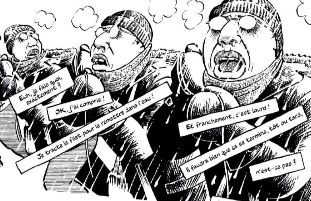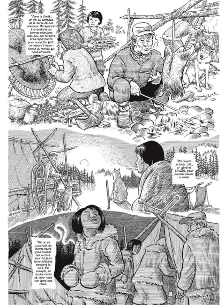 Et le quatrième, le plus impressionnant est celui des récits encadrés des différents témoins qui retrace leur vie, leurs souvenirs et ceux de leurs peuples. C’est là qu’on observe le plus de variété avec parfois des pleines pages ou des doubles plages sur fond blanc construites en de véritables plans séquences de toute beauté de paysages enneigés, de campagne de pêche, de naissance (comme la première page époustouflante) mais aussi d’explorations minières.