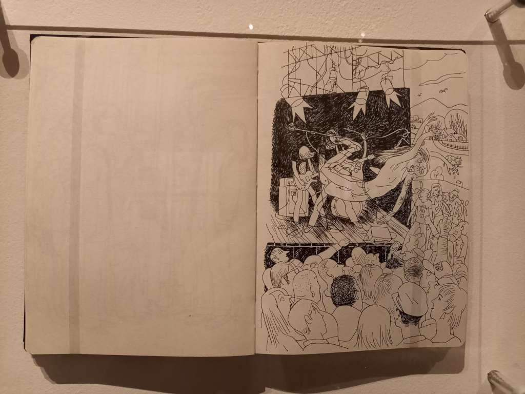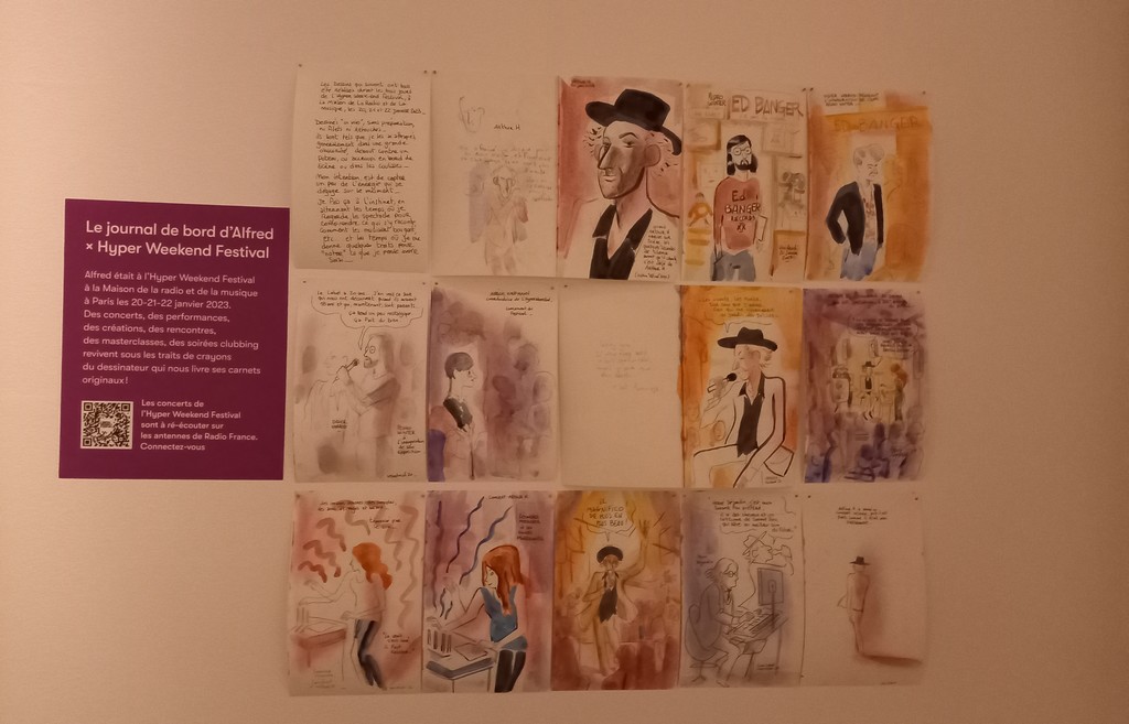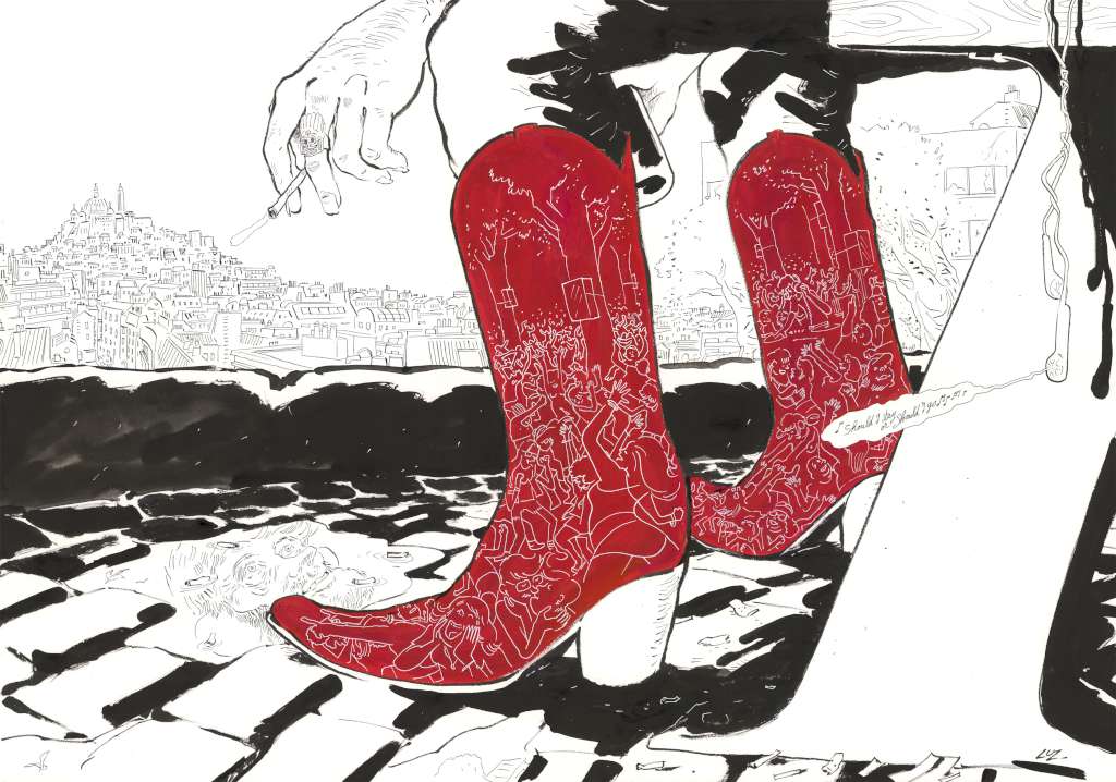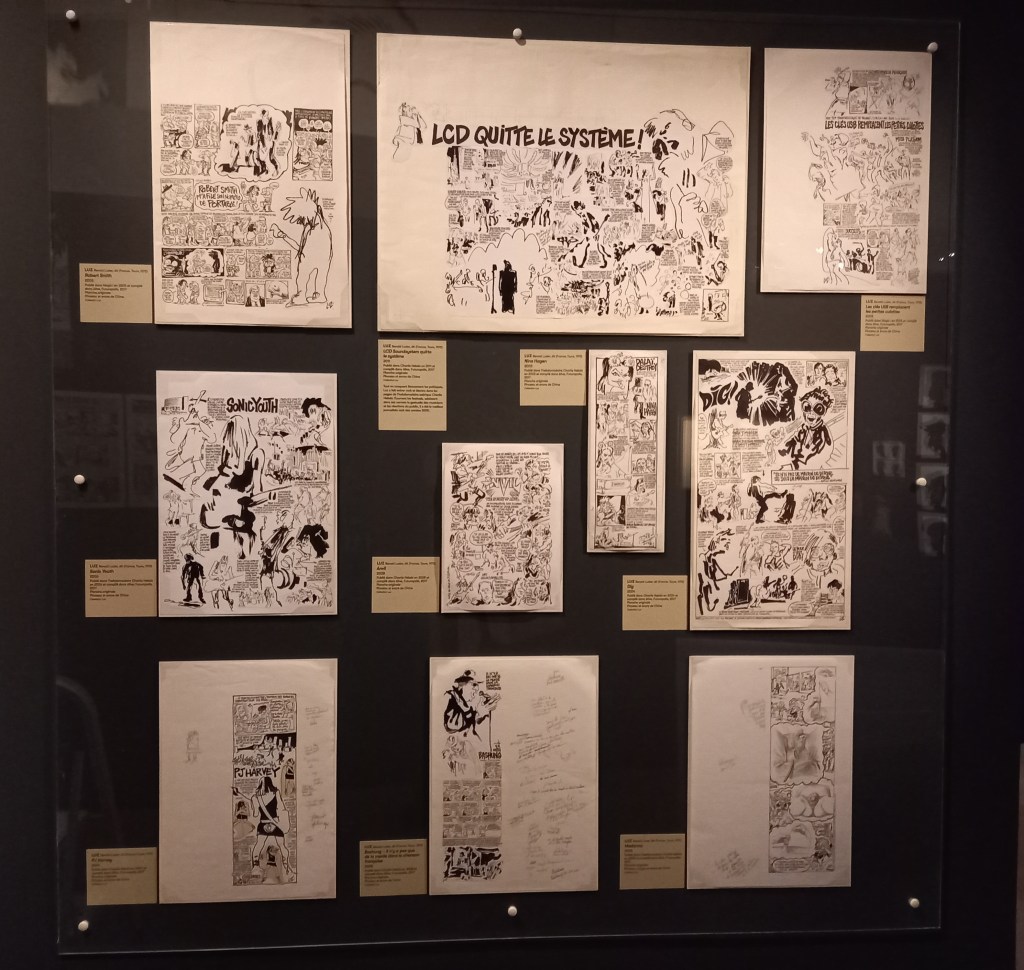 Tout au long de l’exposition, on va croiser plus de 50 dessinateurs et dessinatrices français et internationaux. Planches, pochettes de disques, couvertures de magazines, carnets de dessinateurs, archives vidéos, clips envahissent les différents espaces.
