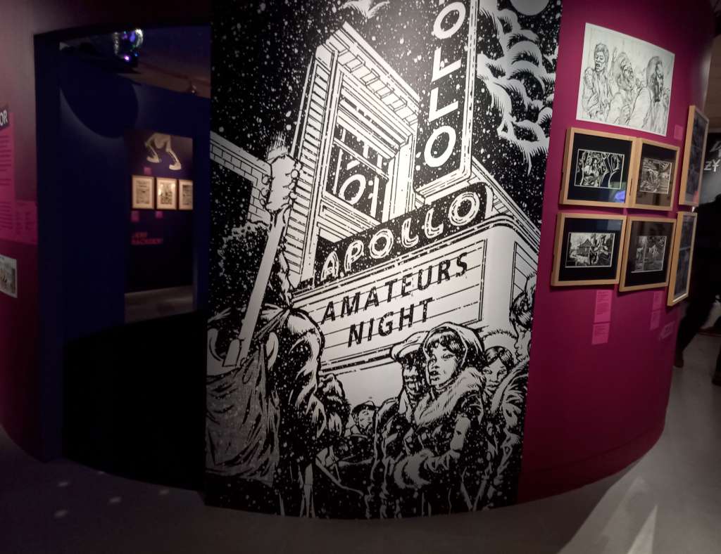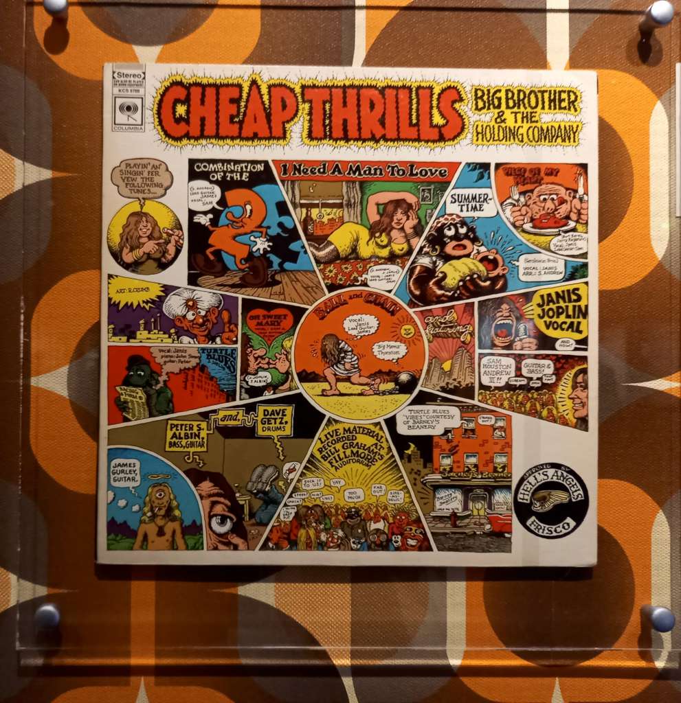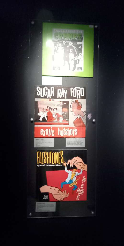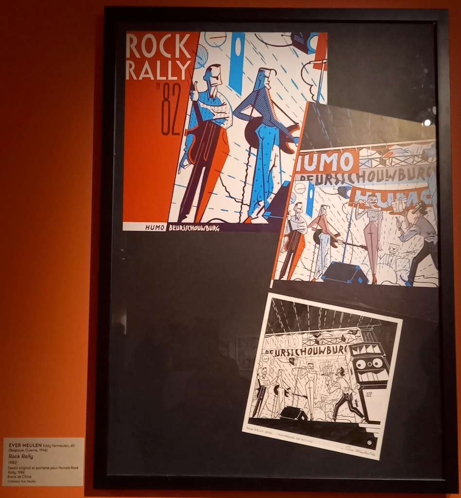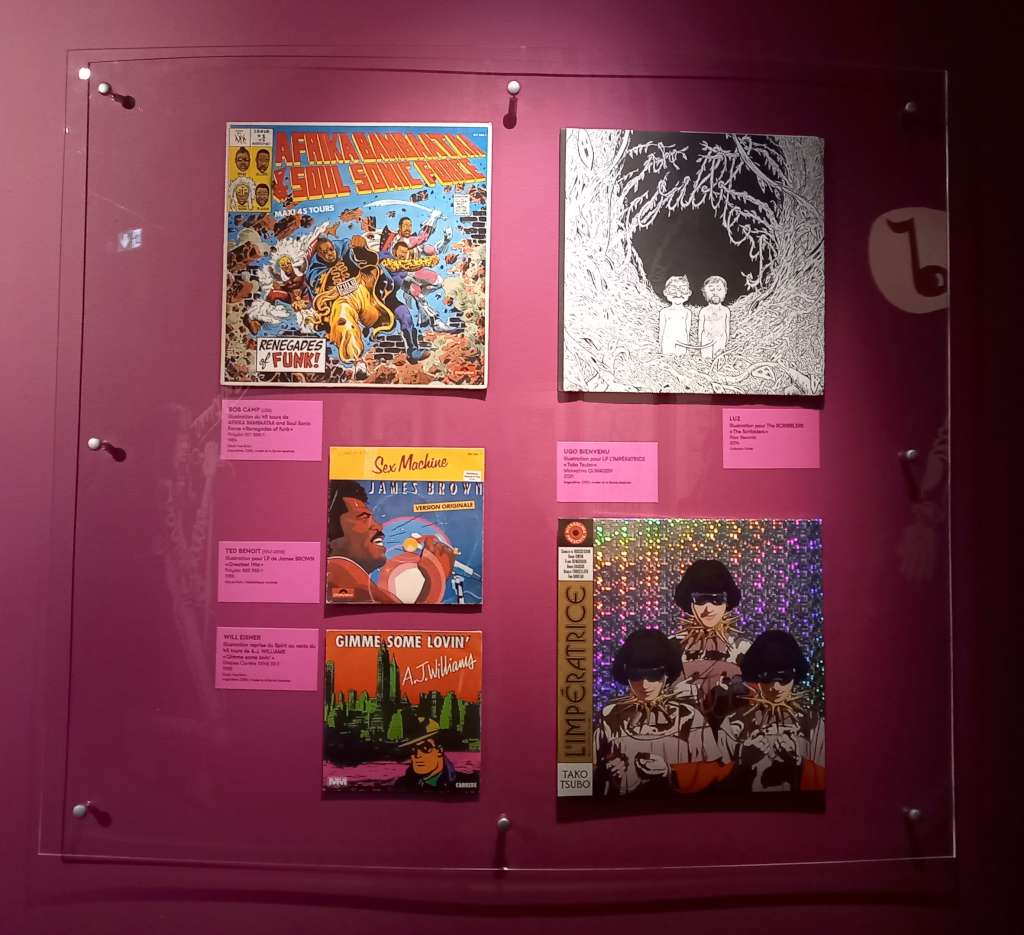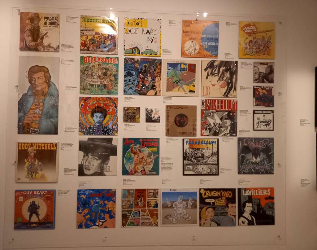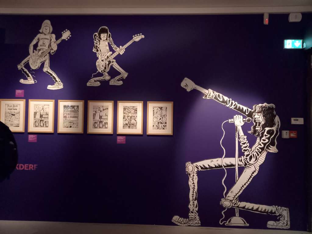 BD et rock, ces deux trublions avaient tout pour s’entendre : Les dessinateurs quand ils n’étaient pas eux-mêmes musiciens écoutaient du rock en dessinant leurs planches. Quant aux musicos, ils étaient nombreux à se plonger dans les fanzines et la bd underground de l’époque. Après une courte introduction consacrée à la musique dans la BD jeunesse, nous pénétrons dans l’antre de la bd adulte. Tout commence avec les comics underground américains avec en figure de proue Robert Crumb auteur de bande dessinée mais aussi musicien compositeur qui fit dialoguer rock et bd dans les pochettes de disques telle la cultissime pochette du LP Cheap Thrills de Janis Joplin ou plus précisément de Big Brother and the Holding Company mais également dans le comix qu’il a créa en 1968 Zap Comix. Aussi dès notre entrée dans l’expo, se trouve-t-on tout de suite plongé dans les années 70 et leur inénarrable papier peint, un espace cosy avec fauteuil et télé étant consacré au maestro Crumb.