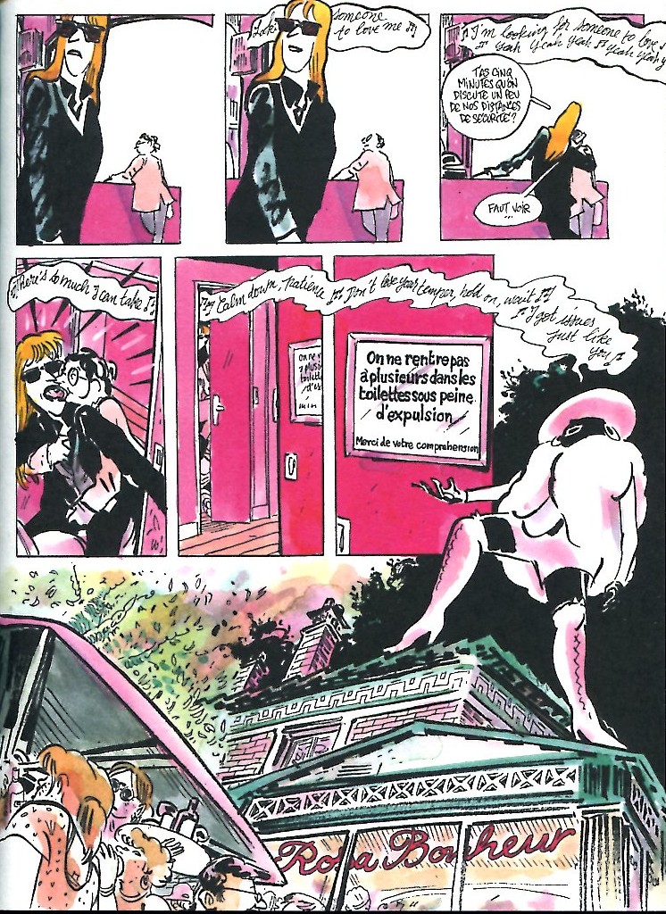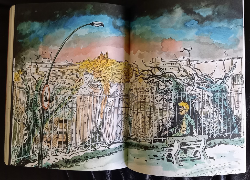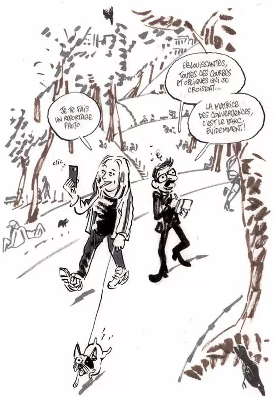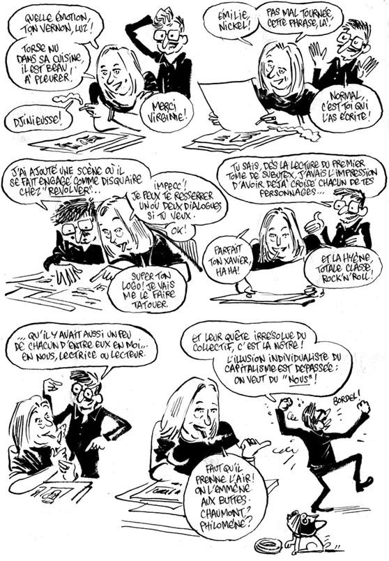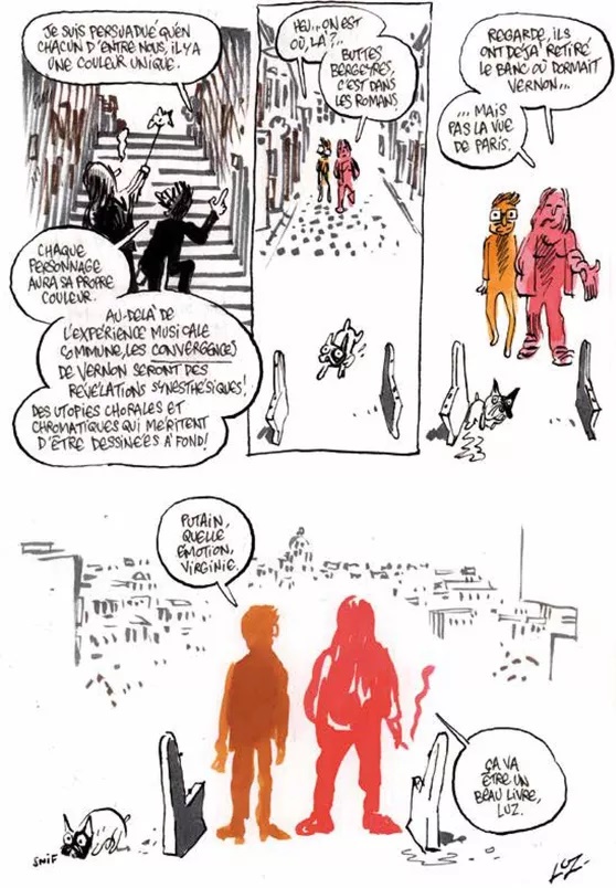 Pour les décors ; Le Paris du 1er tome – le XIIIe , les Buttes-Chaumont, la butte Bergeyre, le Rosa Bonheur … – tout comme le Barcelone du tome 2, Luz est allé en repérage sur place avec Virginie Despentes, retrouvant ainsi le plaisir du reportage dessiné, peut-être ce qui lui manque le plus depuis qu’il a quitté Charlie.