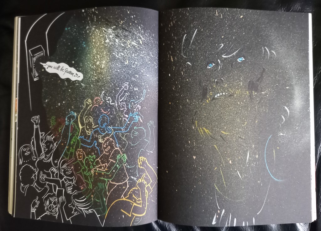 Je confirme. Luz est bien un artiste qui nous livre là une interprétation virevoltante et bouleversante, débordante d’énergie et d’empathie à travers ses percutantes métaphores graphiques qui n’appartiennent qu’à lui et subliment la verve de l’autrice : la référence détournée à Bambi, des pochettes d’album qui prennent vie, l’utilisation d’objets telles les bouteilles d’alcool pour nous faire pénétrer dans la psyché des personnages, les scènes qui s’impriment sur les vêtements ou la peau des personnages.