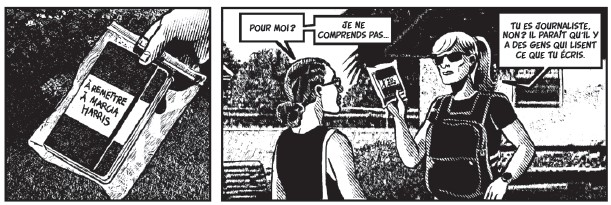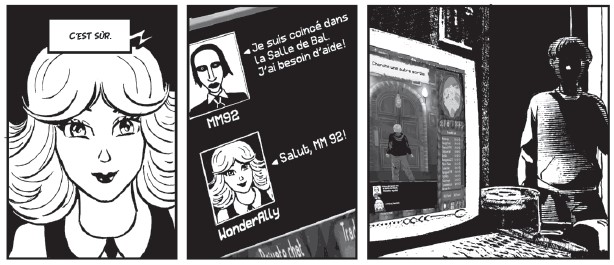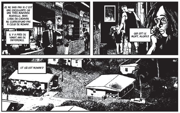 Le trait de Keko, son encrage puissant mettent particulièrement en valeur les ambiances oppressantes et la tension qui traversent le récit. Par moments, il délaissera son noir et blanc tramé pour un trait simplifié et des aplats pour marquer le passage au virtuel, rendant ainsi le propos encore plus glaçant. Découpage, cadrage, reconstitution des lieux … la représentation graphique est à la hauteur du scénario : parfaite !