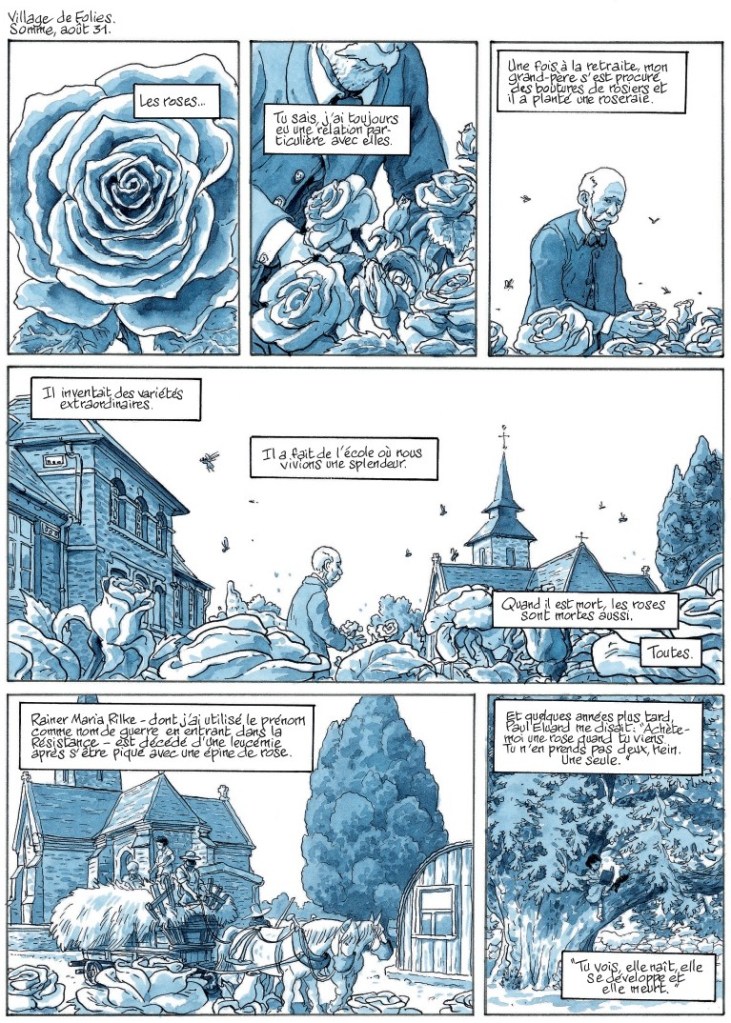 Et puis, il y a l’extrême finesse et intelligence de la mise en scène, l’art de pratiquer l’ellipse du scénariste Jean-David Morvan. Les trois premières planches qui ouvrent l’ouvrage plantent le décor : double page panoramique sur le village, la petite Madeleine bouquinant dans son arbre, le grand-père paternel, ce barde tant aimé, et les roses … Puis moteur, on passe à l’action avec les évènements clés de l’enfance et de l’adolescence qui conduiront Madeleine à rejoindre la résistance sous le pseudonyme de Rainer.