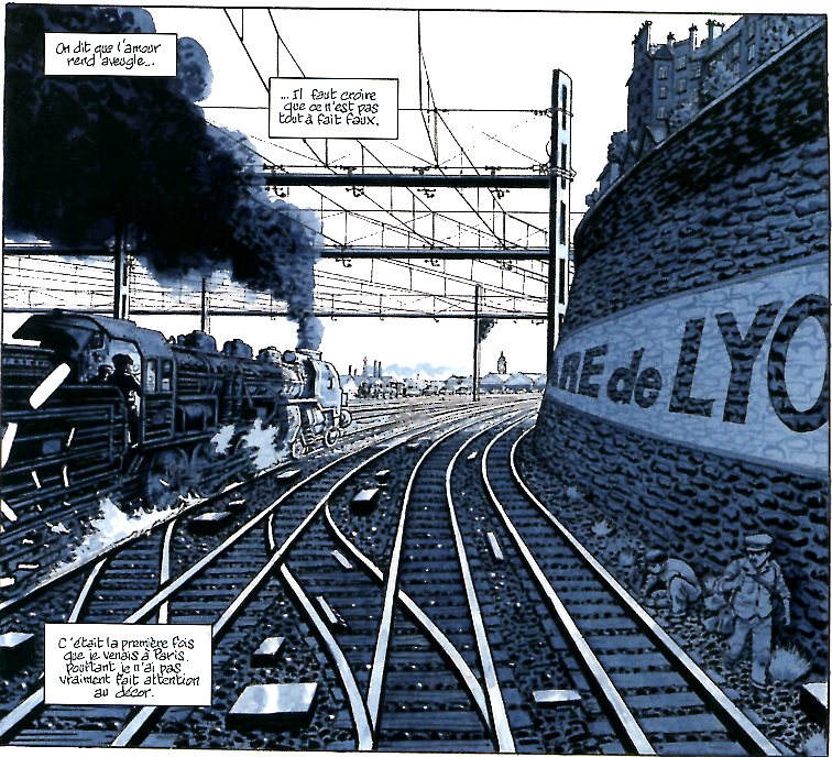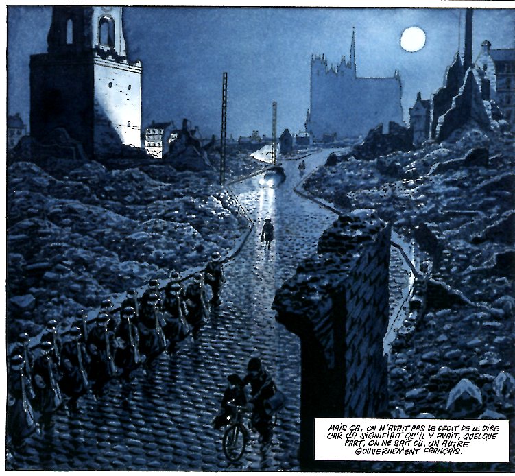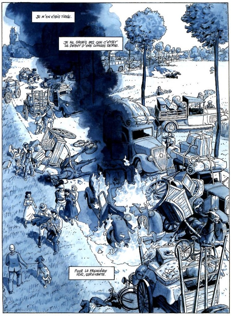 Ah le bleu … Après la période bleue de Picasso qu’évoque Madeleine, puis le bleu Yves Klein voici donc le bleu Bertail. Pourquoi ce choix ? Le dessinateur nous confie qu’il n’aurait pas pu raconter cela en couleurs et ce pour 2 raisons : La première étant que les couleurs de l’exode sous le soleil printanier et celles de l’insurrection parisienne sous un soleil estival entraient en totale contradiction avec le côté dramatique des évènements. La seconde est que les seuls documents couleur de l’époque étaient allemands. Pourquoi pas le noir et blanc alors ? Pour deux raisons également. Le bleu permet d’adoucir un peu le propos et la lumière créée par ce bleu si particulier rend le blanc très lumineux. De plus, c’est la seule couleur qui va jusqu’au noir dans ses tons les plus sombres.