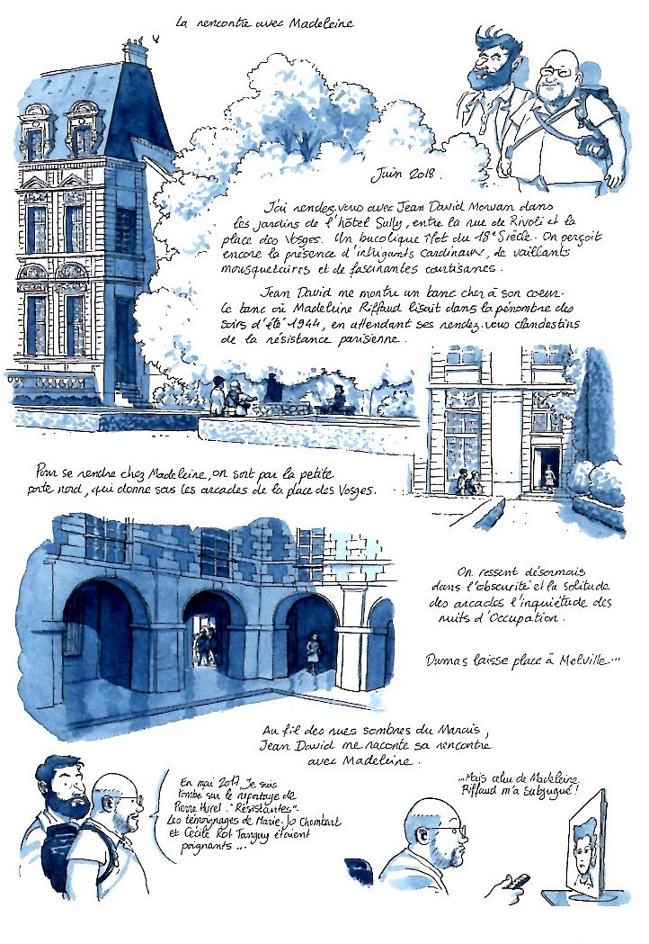 Quelques appendices des cahiers vont se retrouver dans l’album : notamment en introduction une préface de Madeleine et en fin d’album une petite BD composée de quatre planches qui nous resitue le contexte d’élaboration et de réalisation du projet qui a vu le jour en 2017 et a donné naissance à une belle amitié et complicité entre Madeleine, Jean-David et Dominique tombés sous le charme de la voix de cette Shéhérazade des temps modernes et captivés par l’espièglerie, l’énergie et la solarité de celle qui va fêter ses 99 printemps en cette date ô combien symbolique du 23 août.