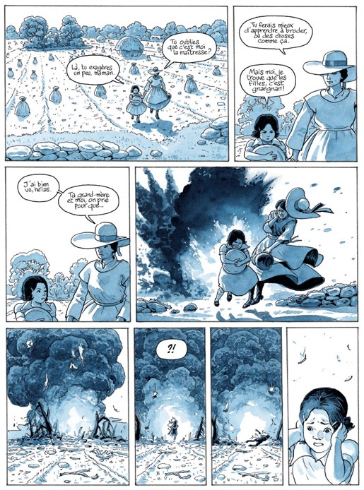 Le récit est sublimé par l’illustration de Dominique Bertail. Le choix d’un gaufrier à trois bandes et de six cases maxi par page ainsi que les magnifiques planches panoramiques pleine page ou s’étalant sur une double page contribuent à la lisibilité de l’ensemble. Ses reconstitutions, son souci du détail sont traduits par un trait réaliste et de splendides aquarelles monochromes exploitant toutes les nuances et les profondeurs de bleu qui retranscrivent parfaitement les différentes atmosphères. Une mention toute particulière pour les planches consacrées à l’exode et aux scènes de nuit.