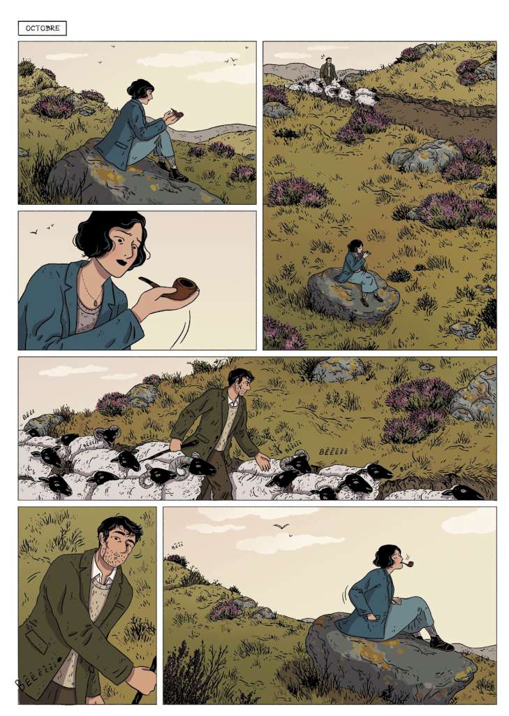 C’est ce que l’on voit à travers le portrait des trois sœurs Ferguson qui s’émancipent peu à peu d’une société patriarcale. L’héroïne Moïra, va le faire malgré elle : mère au foyer, elle se retrouve seule quand son mari instituteur, Ian, décède brutalement à 38 ans d’un infarctus. Elle qui n’avait jamais travaillé va devoir apprendre un métier et gagner son autonomie grâce à l’exemple de sa sœur Margaret qui a toujours choisi sa liberté avant tout. D’ailleurs ce n’est pas un hasard si Cécile Becq a donné à l’aînée de la fratrie les traits qu’arborait Isoe, la tante de Nagisa, dans « Ama » : Margaret joue comme dans l’œuvre précédente le rôle de mentor et fait fi, comme elle, des conventions. De même la jeune Effie qui avait fait un beau mariage doit gagner son indépendance après la trahison de son mari volage. Ces apprentissages douloureux ne peuvent se faire que parce que les trois sœurs s’épaulent, se consolent mais aussi se challengent et se chamaillent.