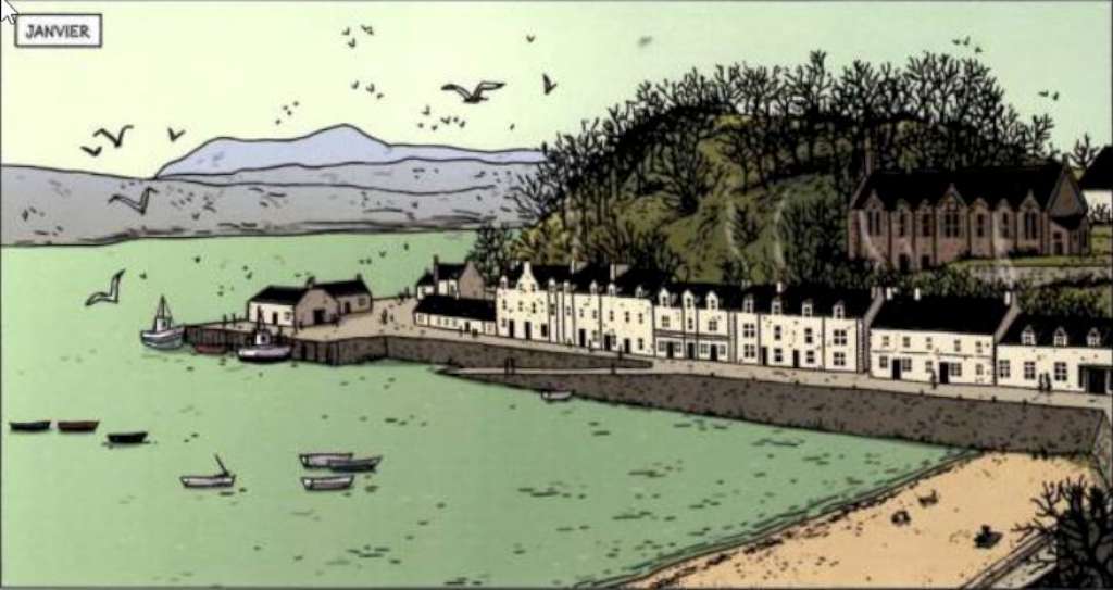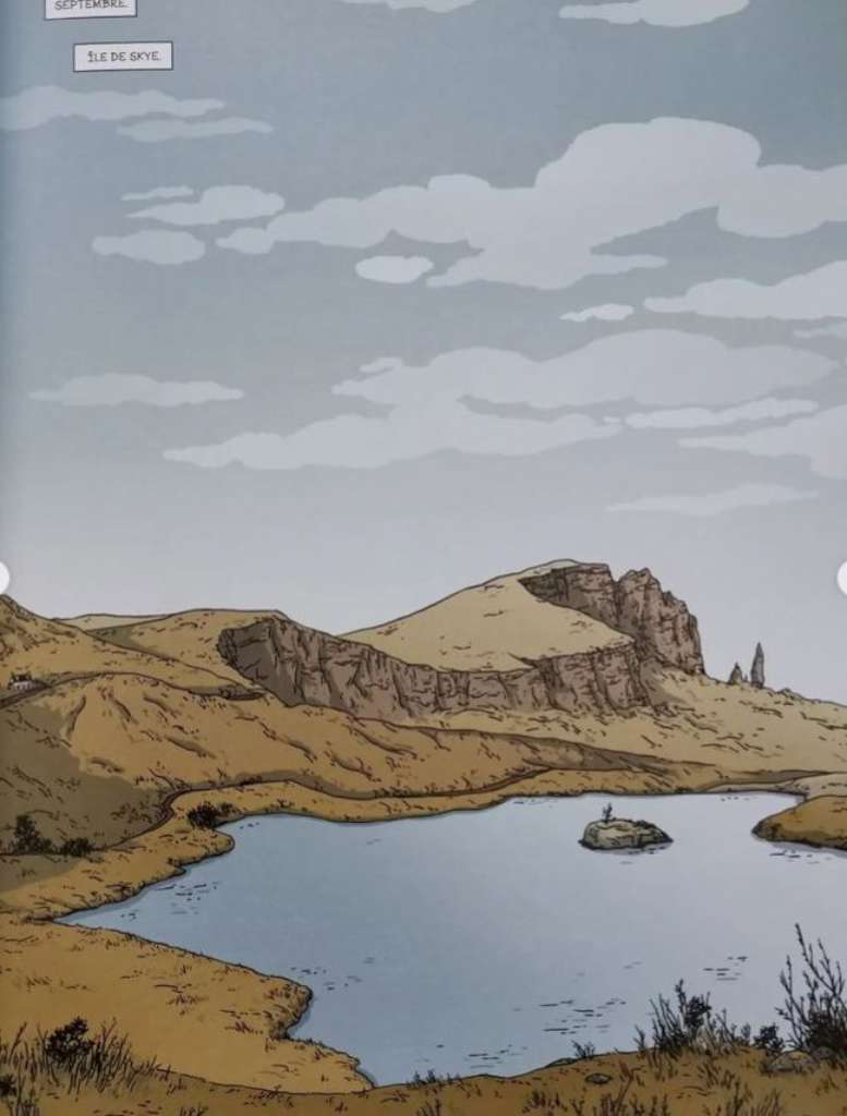 Cécile Becq avait envie de poursuivre dans la veine du récit intimiste et féministe et c’est après un voyage en Ecosse qu’elle a eu le déclic : tombée amoureuse de l’Ile de Skye, elle a souhaité en représenter les paysages et les lumières changeantes. On y retrouve des lieux emblématiques : le Old man of Storr sur la crête de Trotternish, Quiraing et ses tourbières, les falaises de Nest Point, le village de Staffin et sa plage ainsi que la ville aux façades colorées de Portree que l’on peut admirer sous divers angles et dans des couleurs et des lumières qui varient selon les saisons.