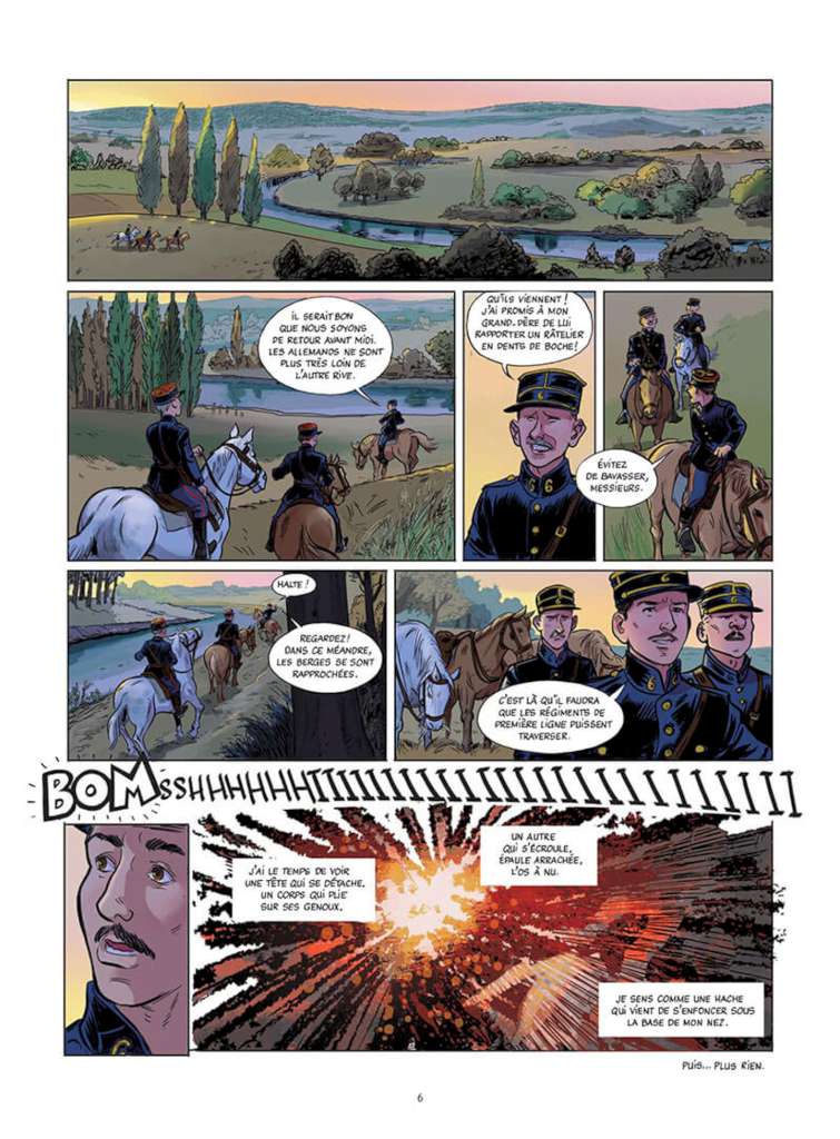 L’horreur de la guerre est également montrée grâce aux cauchemars du protagoniste dans une esthétique très expressionniste qui peut rappeler l’œuvre d’Otto Dix et surtout grâce à l’alternance avec les flashbacks heureux de la rencontre avec Clémence. Aux couleurs plutôt ternes de la chambre du Val de Grâce succèdent les couleurs franches d’une journée d’août, le bleu, blanc rouge vif des drapeaux des képis et des pantalons garance et la robe verte couleur d’espoir de l’héroïne. Les cases plutôt petites dans les scènes d’hôpital occupent alors davantage d’espace allant jusqu’à la demi-page.