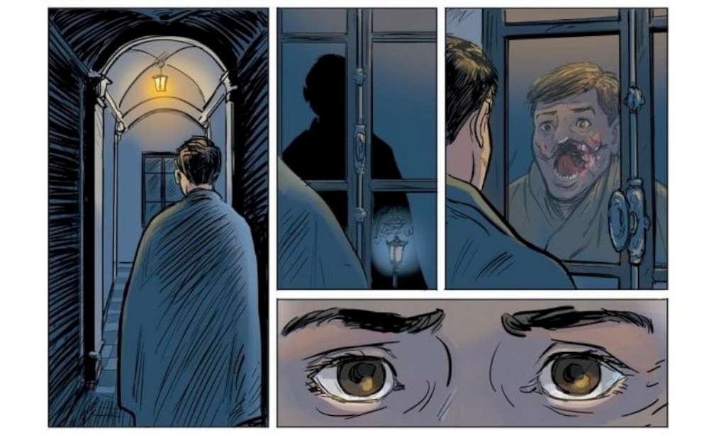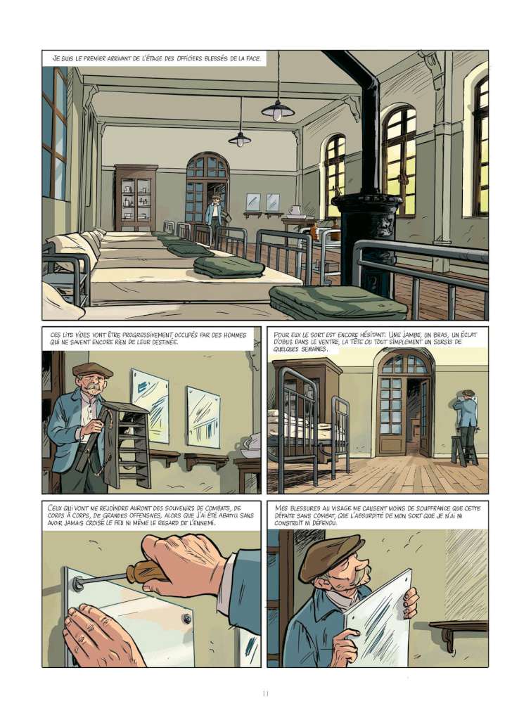 Mais le point le plus remarquable semble être la représentation par Alain Grand de l’horreur des mutilations. Dans une première vie ce dessinateur était en effet chirurgien dentiste ; l’on peut dire que ses portraits de gueules cassées et les détails des expérimentations auxquelles se livrent les médecins sont d’une précision clinique tandis que le roman reposait sur l’imagination du lecteur et que le film semblait plus édulcoré. Tout le début de la bande dessinée est en « caméra subjective » : les gens sont vus par Adrien mais lui n’est jamais montré. Cela crée un effet dilatoire : nous découvrons le visage du héros au même moment que ce dernier dans le reflet d’une fenêtre ce qui favorise le sentiment d’identification et décuple le sentiment d’horreur et de gâchis.