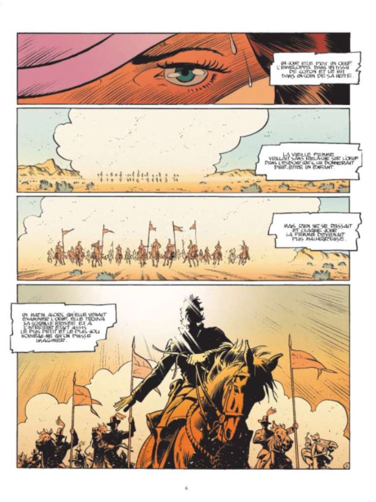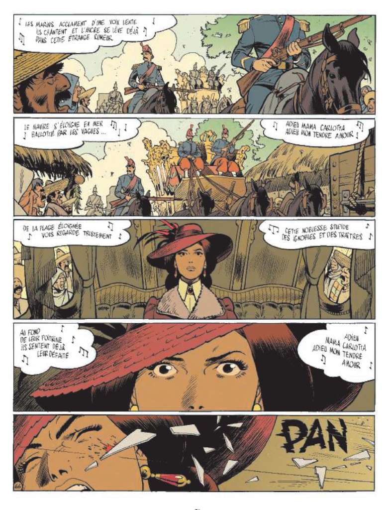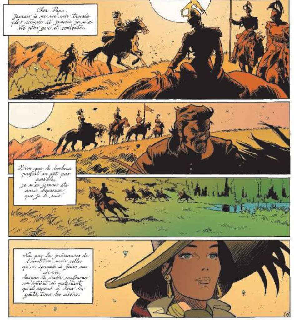 Sam Peckinpah et Sergio Leone s’invitent alors chez Visconti. La scène d’embuscade est un clin d’œil à « Vera Cruz » qui retrace partiellement l’histoire de Charlotte et l’épopée mexicaine (on y retrouve même des ruines mayas !) Aux ambiances feutrées des intrigues de palais succèdent des charges à bride abattue, de rudes affrontements entre garde impériale et guérilleros, des scènes de geôle ou d’auberge glauque. Matthieu Bonhomme féru de westerns a fait ses gammes en réalisant en tant qu’auteur complet deux « Lucky Luke » en parallèle de « Charlotte ». Il nous régale de scènes de bataille dans des déserts arides aux tons ocres sur fond de ciel bleu où l’on perçoit bien la chaleur du climat, la poussière farineuse, et la violence des combats.