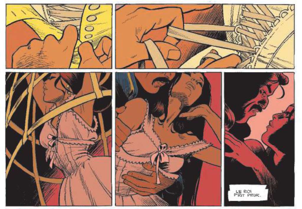 Son utilisation de la lumière est aussi remarquable. Son encrage et ses grands aplats de noir sont encore plus présents dans ce tome dans lequel l’atmosphère s’assombrit. Et les couleurs magnifiques de Delphine Chedru (qui a remplacé Isabelle Merlet depuis le tome 2) viennent accompagner les différentes séquences, créer les ambiances et accroître la lisibilité.