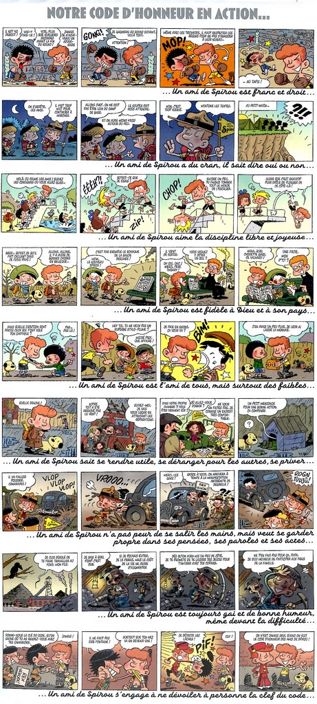 Ah, ils savent y faire nos auteurs car bien évidemment, ce premier album se termine sur un cliffhanger. Et en attendant le prochain album, « Un ami de Spirou a du cran, il sait dire oui ou non« , on peut toujours prolonger un peu le plaisir en lisant les 4 pages documentaires qui, outre un fac-similé (caviardé) du fameux article de Jean Doisy point de départ de cette série, comprend de courts textes retraçant la création du Journal de Spirou, des ADS, une bio de Jean Doisy et cerise sur le gateau le fameux code d’honneur version Morvan/Evrard format affiche détachable.