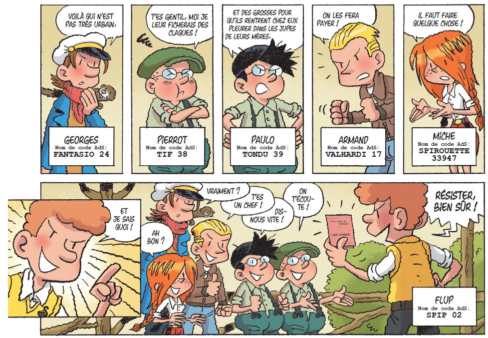 Un ami de Spirou est franc et droit, premier point du code d’honneur donne son titre au 1er volume de cette série « Les amis de Spirou » qui devrait en compter neuf et, mêlant réalité et fiction, nous narre les aventures pleines de rebondissements d’une bande de gamins sous l’occupation en 1943. Ça, c’est le premier axe annarratif.