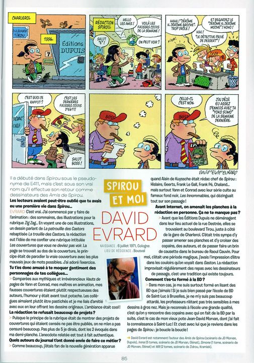 « Les recherches ont été faites dans le cadre de La véritable histoire de Spirou et les publications réalisées après coup. Lui est mort en 1955. Jean Doisy était son pseudonyme en temps que journaliste et rédacteur en chef mais son vrai nom c’était Jean Georges Evrard. Sous son vrai nom, c’était un homme très engagé politiquement depuis qu’il avait une vingtaine d’années. On a eu la chance de rencontrer sa belle-fille qui l’a rencontré en 1947 et qui l’a bien connu. Elle nous a raconté beaucoup de choses sur l’homme qu’il était, sur l’homme à principes, sur le quotidien, sur la façon qu’il avait de considérer son métier et les livres qu’il écrivait. Mais curieusement, sur la partie politique, on n’avait rien, mais vraiment rien. Donc on est allé fouiller dans les archives du ministère de la défense à Bruxelles et là, par chance, comme il avait beaucoup de faits d’armes, il avait demandé une reconnaissance de résistant à la libération et là , il y a tout le détail de ce qu’il a fait. Mais là encore, on apprend plein de choses mais on n’apprend pas tout. Il a fallu qu’on rencontre un tas d’autres personnes, qu’on croise les informations. Plus on creuse, et plus on se rend compte qu’on ne sait rien sur lui et qu’il conservera encore une part de mystère. Pourquoi est-ce qu’il était si engagé politiquement du côté des communistes et n’avait pas sa carte ? On a suffisamment de matière pour en faire une bande dessinée. On n’a pas suffisamment de matière aujourd’hui pour en faire une longue biographie détaillée. Mais on va continuer nos recherches car cette bande dessinée, elle nous relance. Pour tout ce qui manquait en fait, Jean-David a trouvé une astuce scénaristique pour pouvoir raconter la vue de Jean Doisy et combler des trous.«