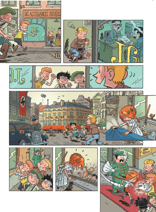 Alors il y a plusieurs niveaux de lecture : Une histoire d’aventure bien dans l’esprit de Spirou, mais aussi un regard sur la résistance belge, sur l’histoire de la bd et plus précisément du Journal de Spirou. D’ailleurs, dès les premières pages les Spiroutistes vont être aux anges et boire du petit lait : on voit la fabrique de céramique F. Dineur, un cabinet d’assurances sur lesquelles s’étalent les initiales JG, l’hôtel Velter…