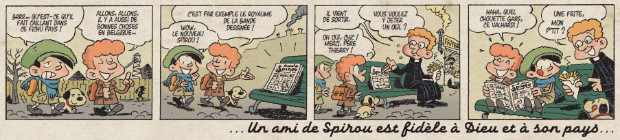 Alors justement prenons le 4ème point du fameux code code « Un ami de Spirou est fidèle à Dieu et à son pays ». Or si la famille Dupuis, très catholique, accordait une grande importance à la religion, Jean Doisy, anticlérical, penchait plutôt du côté du communisme. Comment expliquez-vous ce paradoxe de la présence de Dieu dans le 4ème point ?