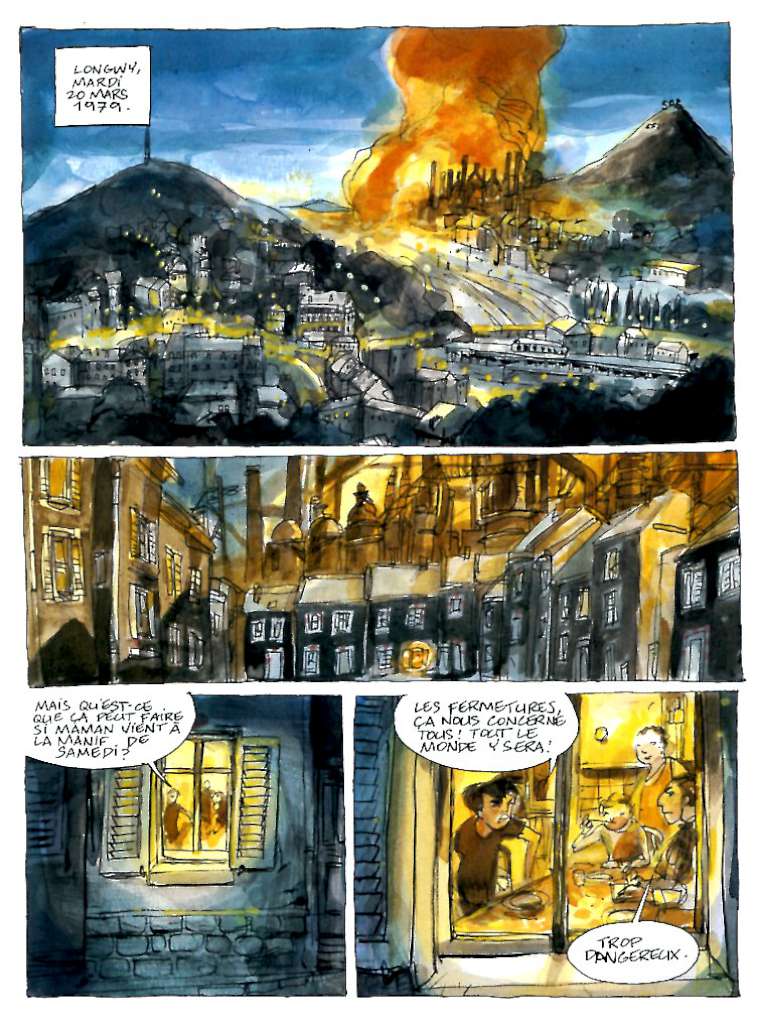 Natif de Nancy, installé à Longwy depuis une dizaine d’années, Vincent Bailly, bien qu’étant sur place a dû malgré tout se plonger dans la documentation et notamment les photos de l’époque pour recréer ce paysage hérissé des hauts fourneaux et du crassier aujourd’hui disparus. Les magnifiques planches en couleurs directes mettent parfaitement en valeur la beauté paradoxale de la ville éclairée de ces feux continus qui ont fait vivre la région tout en consumant par leur nocivité ceux qui les alimentaient. C’est une bande dessinée haute en couleurs dont le choix judicieux des tons employés sert à merveille les différentes atmosphères. Avec ce trait très reconnaissable qui n’appartient qu’à lui le dessinateur rend parfaitement compte de la violence de la situation et en donnant à ses personnages une très grande expressivité, nous fait bien ressentir les différentes émotions qui les traversent.