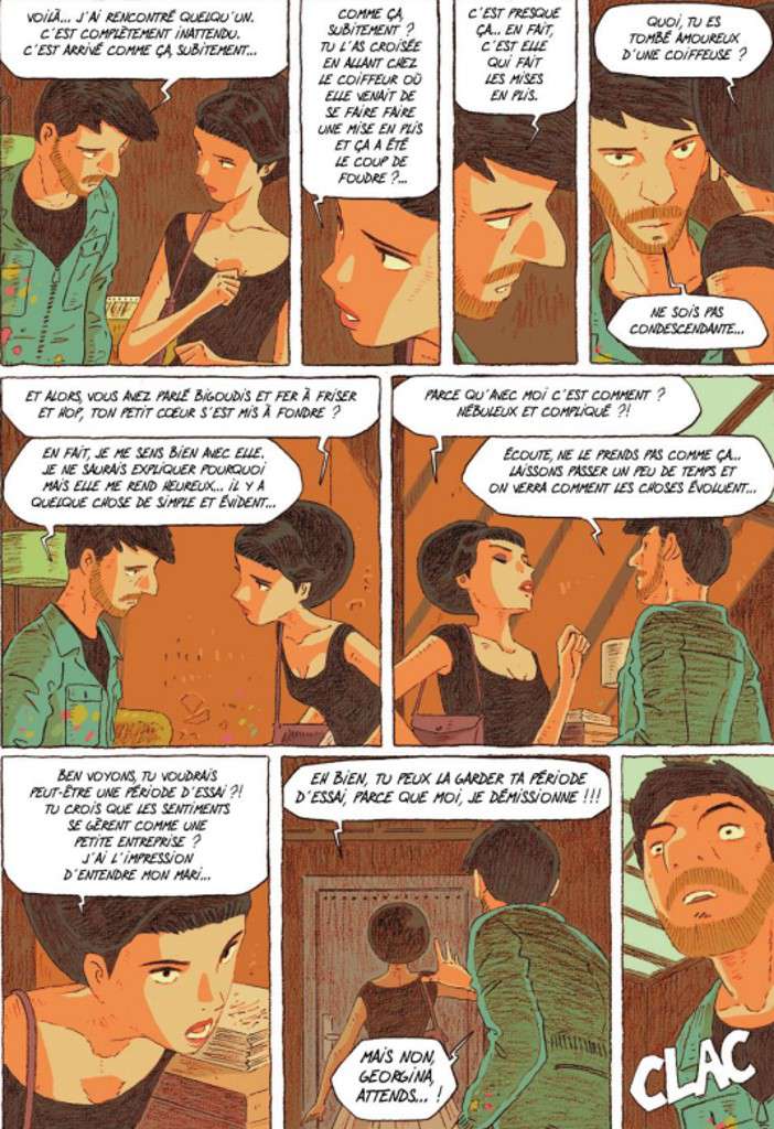 Comme souvent chez Bonin, le scénario est pimenté d’une pointe de fantastique. Ce qui n’aurait pu être qu’une bluette ou un album « feel good » s’avère alors être bien plus que cela grâce à l’ambivalence des personnages : Paul est-il un héros ou un râleur égoïste et antipathique ? Le mari de Georgina est-il l’homme borné qu’elle décrit ? Georgina est-elle si libre qu’elle le dit ? Et Mathilde elle-même est-elle vraiment autant altruiste qu’elle le pense ? Mais l’album acquiert surtout du relief grâce à l’ambiguïté de l’origine du changement qui s’opère dans la personnalité du peintre qui se complait à être « maudit » ou du moins misanthrope et pessimiste.