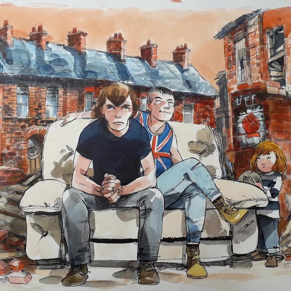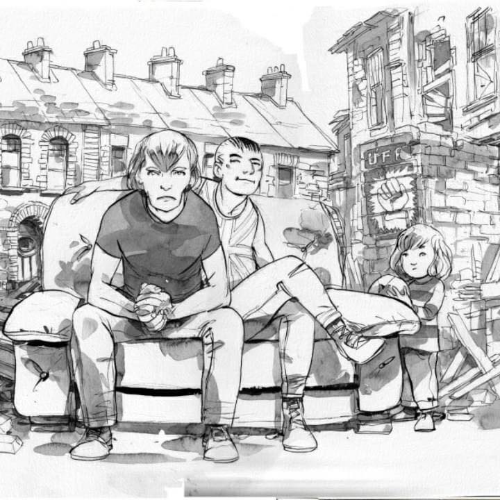 La couverture du tome 1, avec ses tons chauds, lumineux, Tim et Mary souriants, met clairement en évidence la romance. Alors que celle du tome 2, avec ses tons froids ou plus sombres, ses deux personnages masculins, l’un au visage fermé, l’autre portant un t-shirt à l’effigie du drapeau britannique, un enfant (qui n’est autre que Tim) à leurs côtés, la présence sur le mur du poing rouge levé et du sigle UFF (Ulster Freedom Fighters) … nous indique clairement qu’on va changer et d’époque et de registre.