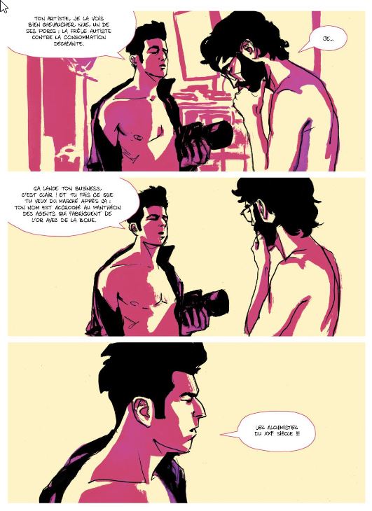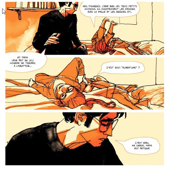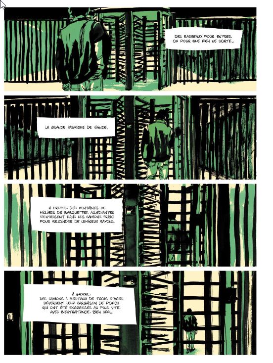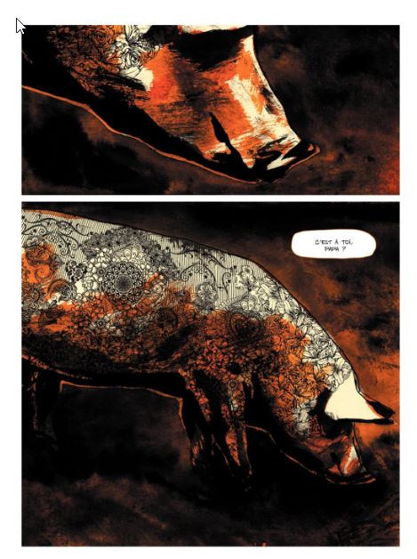 Raconté comme cela on a l’impression d’un pot-pourri de thèmes hétéroclites mais s’il y a bien un mélange des genres, des thèmes et même du noir et des couleurs, tout se passe dans la fluidité des dialogues et de l’enchaînement des séquences. Pas un mot de trop, pas une scène superflue. De nombreuses pages muettes car comme le dit le héros, ancien élève en arts appliqués contraint à se servir non pas d’un pinceau mais d’un « aspirateur à sang » pour tuer « des cochons du matin au soir et une semaine sur deux du soir au matin » dans l’abattoir où il travaille, « dessiner, c’est aussi écrire ».