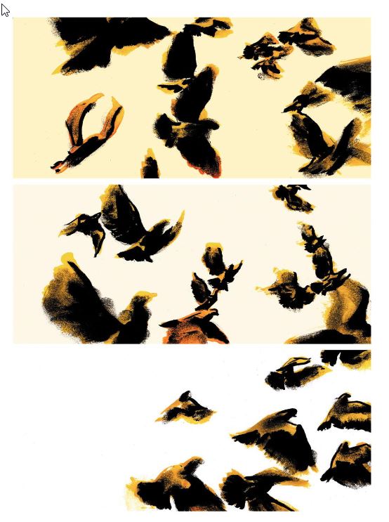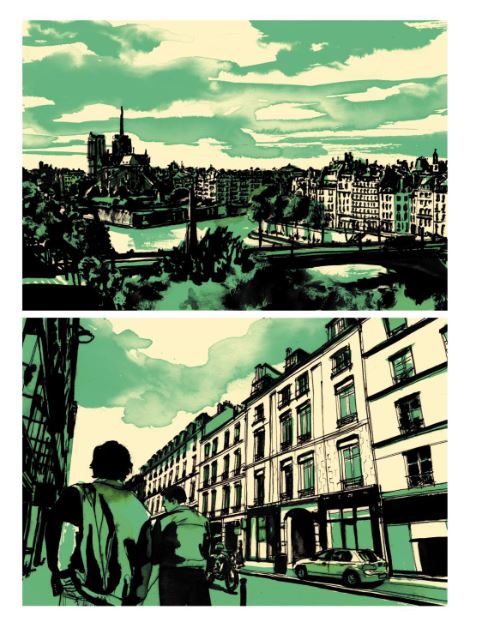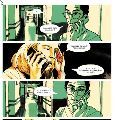Pourtant, même si de grands aplats de noir sont utilisés par Laurent Bonneau et que certaines planches sont quasi semblables à des toiles de Soulages en monochrome de noir et symbolisent cette vision pessimiste, on observe une alternance avec d’autres moments plus radieux. Élisa, même si elle « n’aime pas le jaune », se voit systématiquement associée à cette couleur solaire dans des séquences réalisées dans un camaïeu de jaunes ou d’oranges.
