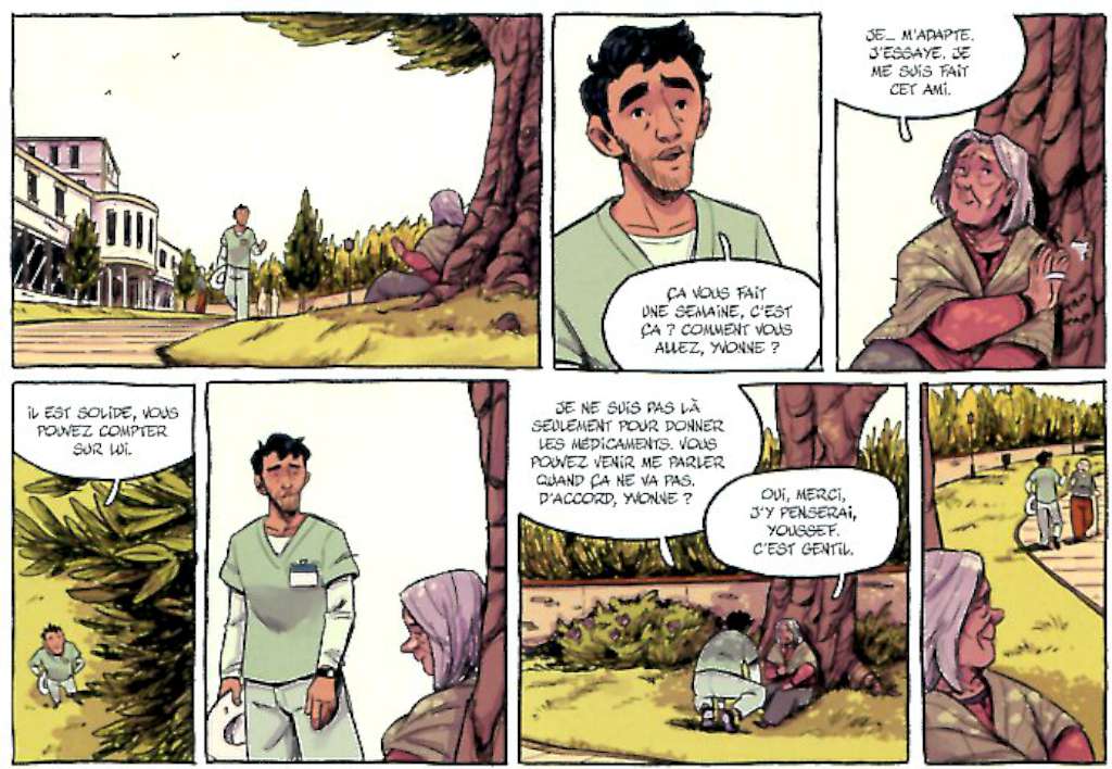 La grande force émotionnelle de ce récit tient tant à l’extrême justesse du ton employé qu’aux situations et aux personnages fictifs créés à partir de vraies rencontres réalisées à l’occasion d’ateliers d’écriture que Séverine Vidal a animés en EHPAD. Le personnage d’Yvonne, esprit rebelle à l’humour ravageur dissimulant une extrême sensibilité, est inspiré de quatre ou cinq résidents qui l’ont soit émue, soit fait rire. Les autres personnages qui composent son nouvel univers sont également extrêmement bien campés : ses ami.e.s, le fameux P.F. mais également Youssef l’infirmier débordant d’humanité et d’empathie ainsi que la directrice de l’établissement stricte, rigide et infantilisante.