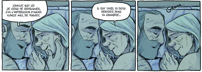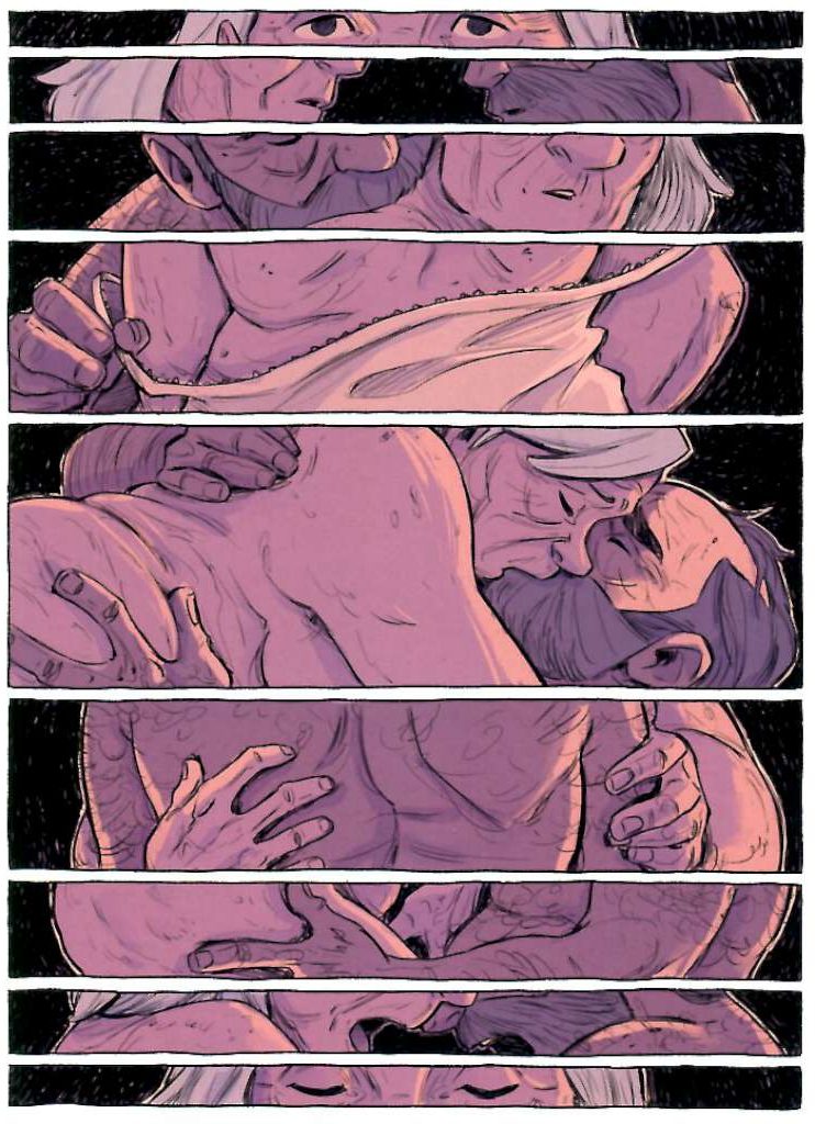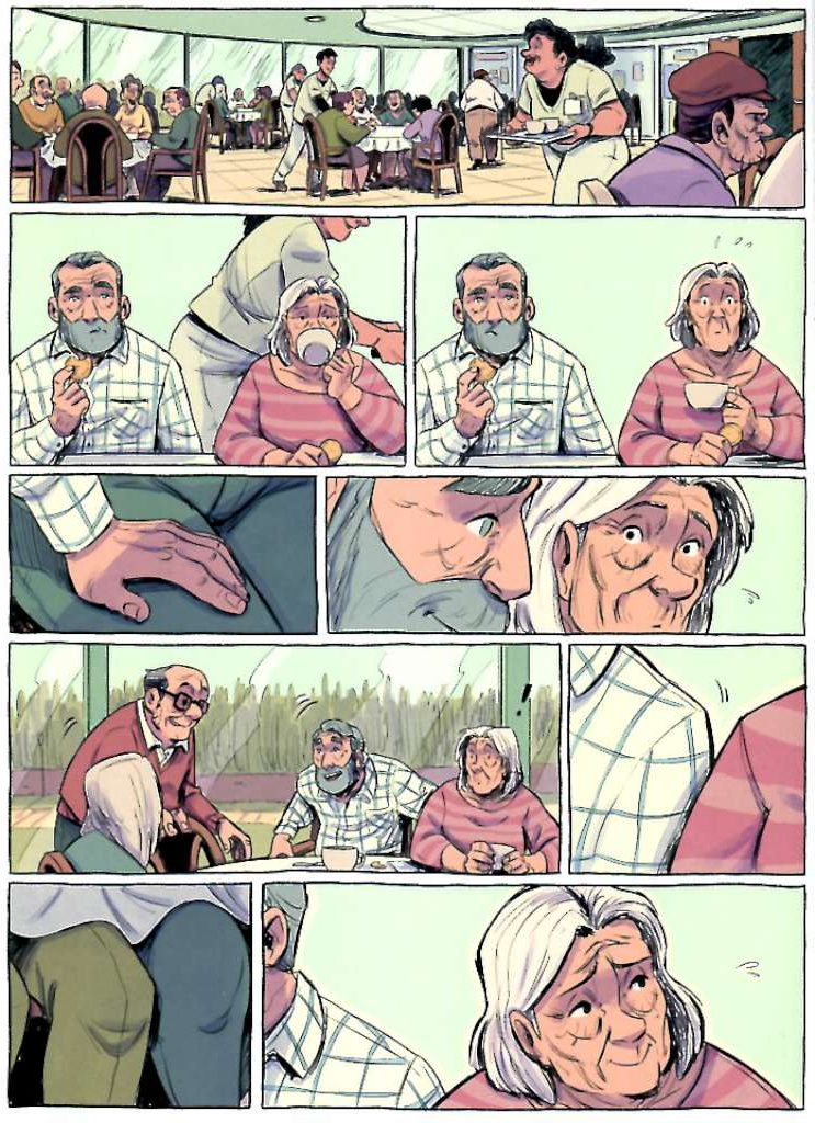 La très grande expressivité des visages, les regards qui en disent long soulignent bien les différents sentiments – tendresse, chagrin, perte, peur de ces mots que soudain on ne trouve plus, des souvenirs qui s’effacent, joie, tristesse, désir, plaisir – qui animent le petit groupe d’amis et font jaillir l’émotion du lecteur. C’est sans fard mais avec sensibilité et pudeur qu’il représente la nudité de leurs corps usés loin de toute forme de voyeurisme.