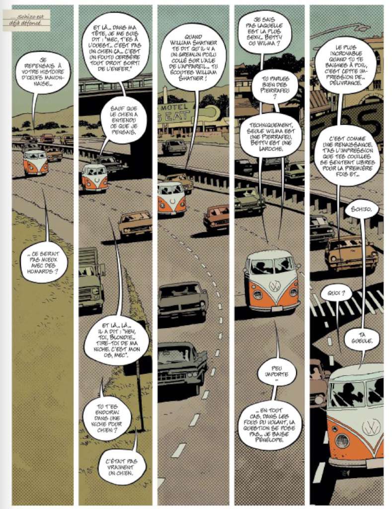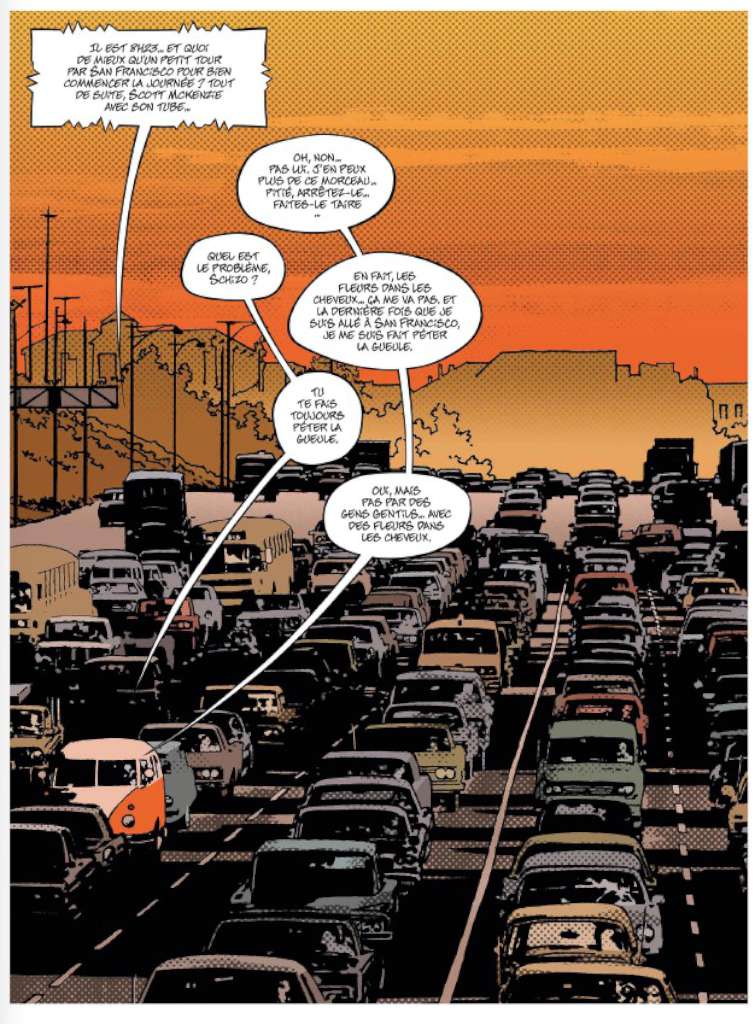 Toute la première partie du récit se déroule à l’intérieur du combi VW à bord duquel nos cinq passionnés de rock effectuent le voyage qui les mène à Altamont et c’est l’occasion pour le lecteur de faire connaissance avec eux.