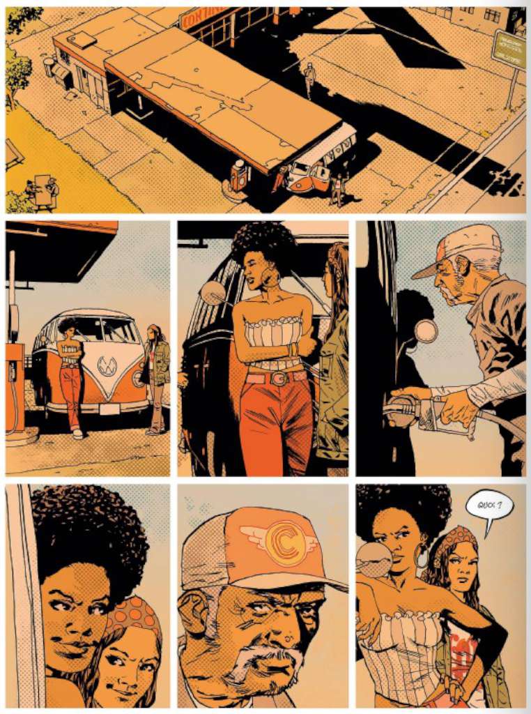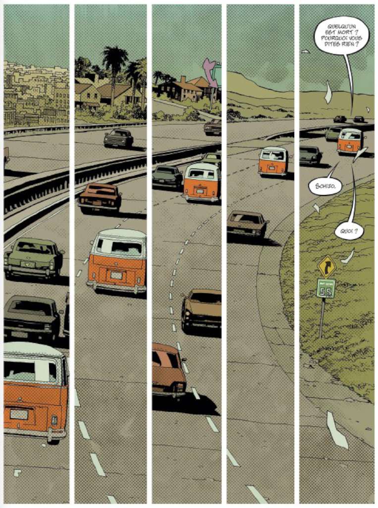 Lumineux au départ, les tons chauds jaunes, orangés du soleil californien vont peu à peu s’estomper pour céder la place à des tons de plus en plus désaturés et s’assombrir encore à l’arrivée à Altamont pour finir en camaïeux de gris à la limite du noir et blanc. Si la dernière planche est en couleur, elle évoque néanmoins plus une scène post-apocalyptique qu’un retour à la normale.