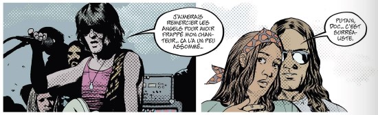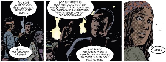Quand Charlie Adlard, le dessinateur de Walking Dead rencontre Herik Hanna, le scénariste de Bad Ass et qu’ils décident de fictionnaliser un des évènements les plus dramatiques de l’histoire du rock, ça donne l’album Altamont paru chez Glénat, récit crépusculaire du very bad trip de cinq fans venus assister à l’évènement. C’est à travers leurs yeux et leur expérience que l’on va vivre la tragédie qui soldera le Flower Power.