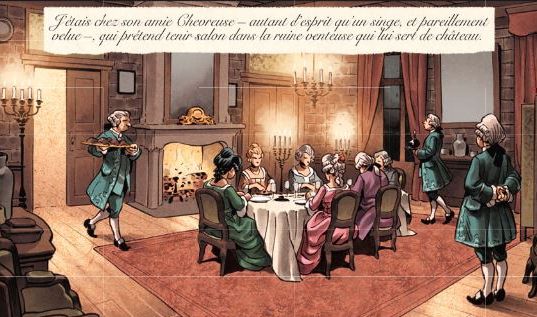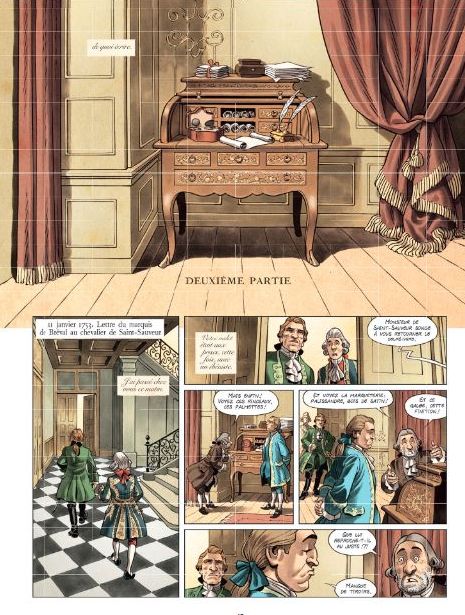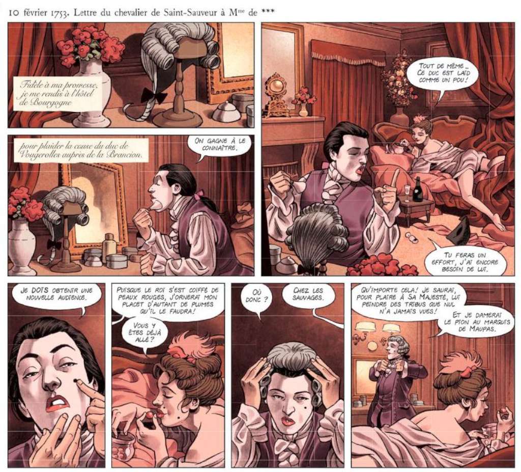 L’histoire se déroule au mitan du XVIIIe siècle et s’achèvera durant la Révolution au moment de la Terreur comme nous l’apprend la préface (ce qui en passant écorne aussi passablement le mythe des Lumières). L’on suit les pérégrinations du chevalier Justin Fleuri de Saint-Sauveur, hobereau désargenté et véritable roué, qui l’emmèneront de châteaux de province à la cour de Louis XV puis en Nouvelle France. L’album est composé en deux volets : une « première partie » qui constitue une sorte de prologue et se déroule sur six mois en 1745, puis une brusque prolepse sur deux pages qui se passe en 1754 et une « deuxième partie » – qui prend place quelques mois plus tôt en 1753. Ainsi le scénariste se joue du temps, du rythme, mais aussi du lecteur : il nous surprend avec le flashforward, nous interroge grâce aux ellipses, et titille notre intérêt en distillant des indices.