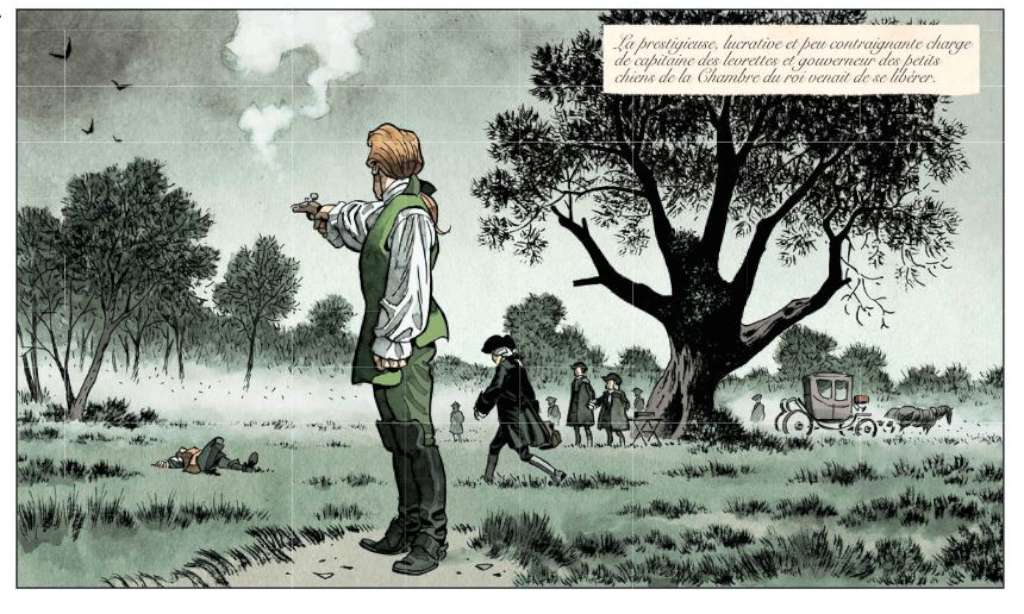 Mais pas seulement … on a aussi dans cet album une réflexion sociale. Le trait de Guérineau est souvent caricatural. Les têtes sont un peu trop grosses, comme s’il voulait souligner l’aspect de marionnettes de ces nobles régis par l’étiquette. Ce côté grotesque et absurde est renforcé par les pépites historiques trouvées par le dialoguiste : qu’il s’agisse de la charge tant convoitée par le héros de « capitaine des levrettes et des « petits chiens » ou des propos du notaire visant à justifier l’esclavage qui, malgré leurs accents à la Montesquieu dans « de l’esclavage des nègres », sont authentiques et à prendre au sens littéral!