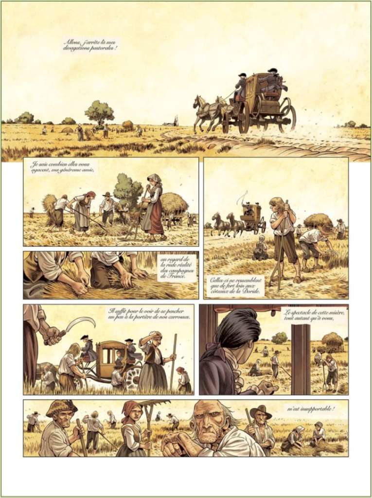 Ainsi, la plume acérée du scénariste souligne les travers d’une société particulièrement inégalitaire dans laquelle certaines personnes sont considérées comme des biens meubles. Le pinceau de Guérineau, grâce aux seconds plans détaillés – le portefaix battu pour avoir abîmé une statue, les campagnards ployant sous la chaleur et le fardeau –rappelle de même, à chaque fois le terreau sur lequel prospérait la noblesse oisive et dépeint très efficacement une France coupée en deux. Ainsi le lecteur s’instruit et réfléchit tout en se divertissant …. Comme dans un conte philosophique, autre genre prisé de l’époque.