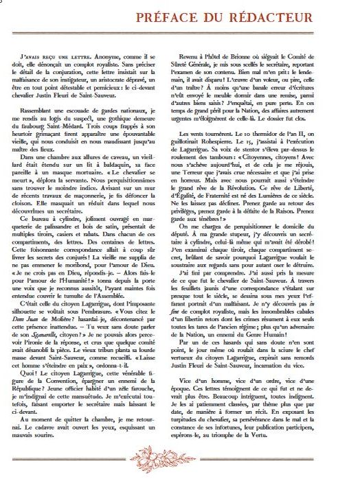 Vice d’un homme, vice d’un ordre, vice d’une époque. Découverte dans les tiroirs secrets d’un secrétaire à cylindre, la correspondance du chevalier de Saint-Sauveur court sur tout le XVIIIe Siècle et dessine l’effarant portrait d’un malfaisant. En exposant les turpitudes de l’infâme libertin et la constance de ses infortunes, la publication de ces lettres participera, espérons-le, au triomphe de la Vertu.