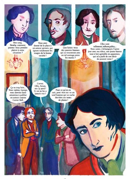 Ainsi, d‘emblée, le lecteur du XXIe siècle comprend dans quelle société patriarcale évoluaient les sœurs Brontë, pourquoi elles ont été obligées d’emprunter des noms de plume et de s’inventer des alter-egos masculins et comment elles ont livré un véritable combat et sont parties en guerre contre leur temps avec comme arme leur plume. Ce que montre fort bien une des planches de l’album :