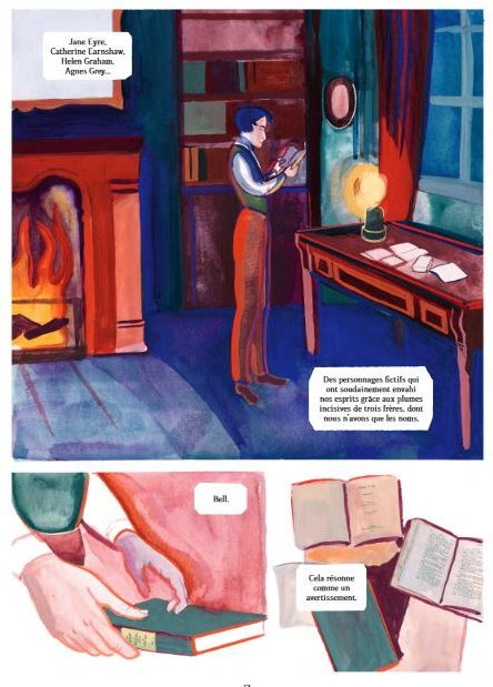 Enfin, pour montrer l’émancipation à laquelle aspire son héroïne, la dessinatrice choisit de jouer sur le gaufrier. Lorsqu’elle traite des scènes de quotidien telles que celles de sa vie de gouvernante, on a des cases carrées, réalistes et construites tandis que lorsqu’on est dans la nature , les jeux de l’enfance ou ceux de l’écriture, la page s’affranchit des gouttières, les compositions se renouvellent et surprennent : on a du mouvement, des cases tourbillonnantes, de la vie, de la gaieté et de la joie dans une palette de couleurs vibrantes et presque fauvistes bien loin des clichés du gothique austère auquel on assimile en général les Brontë.
