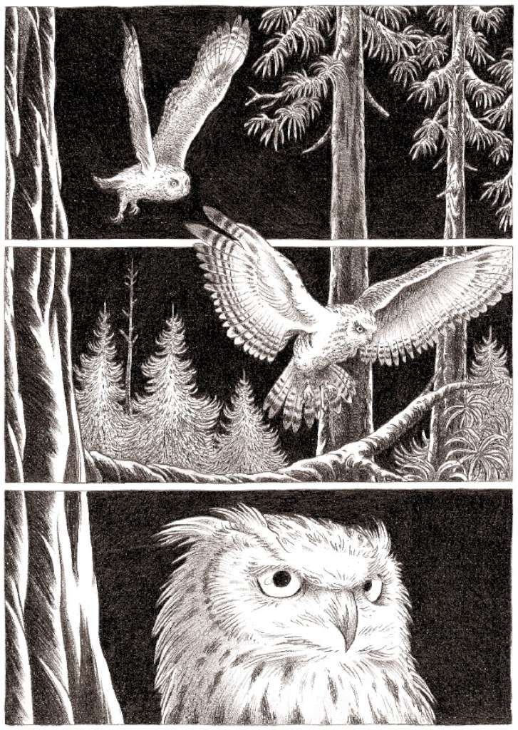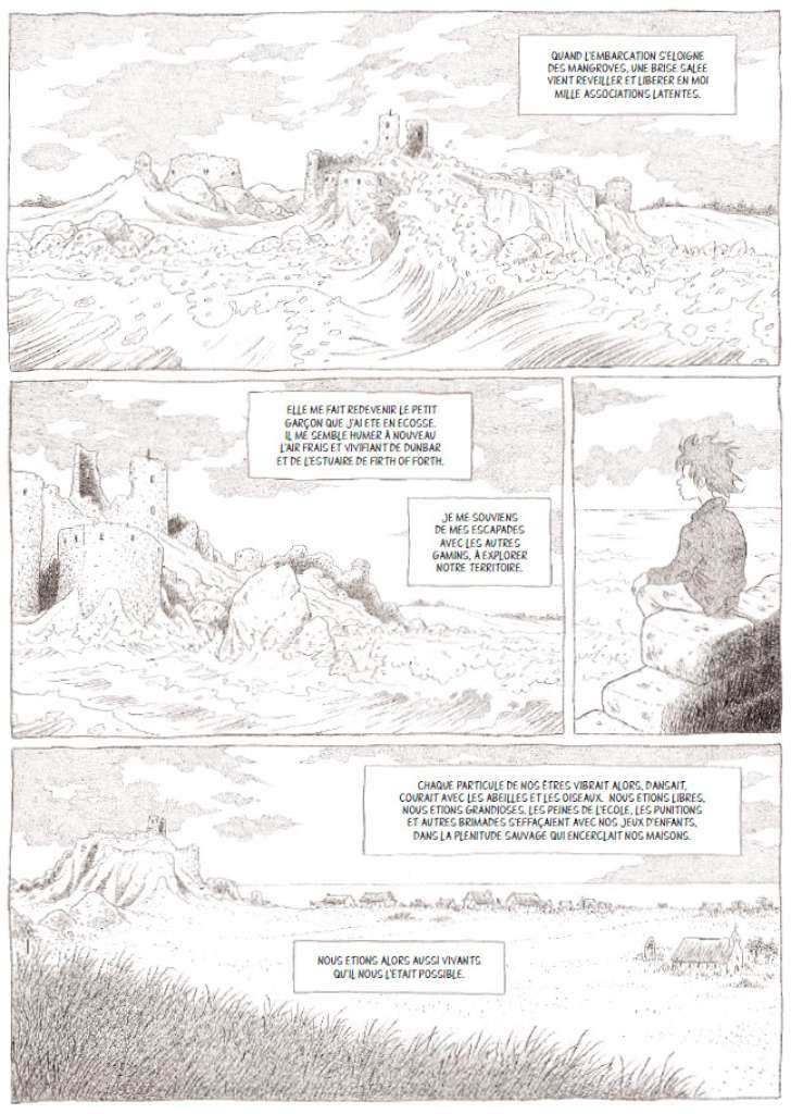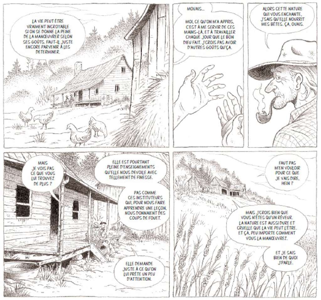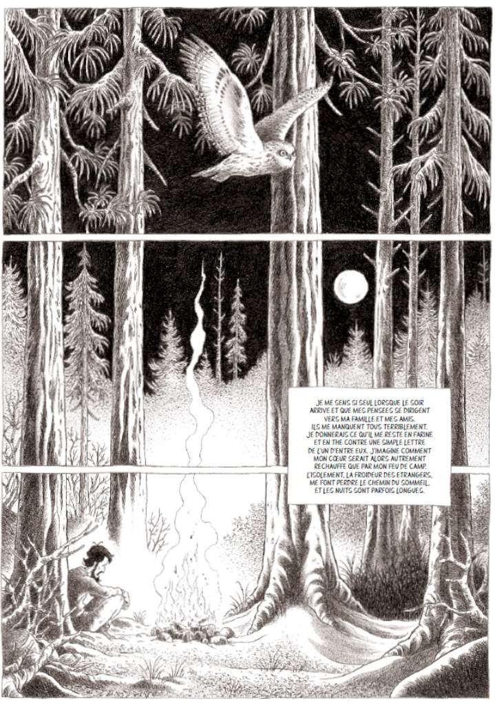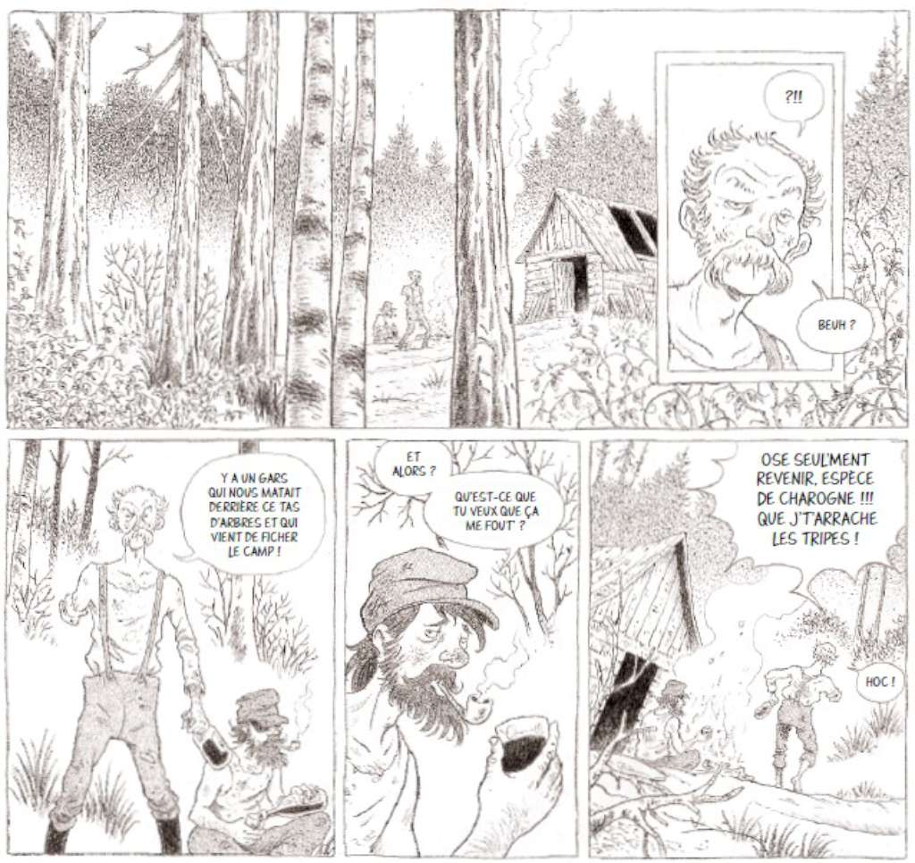 On retrouve ce même procédé ici au service de magnifiques planches muettes sur la nature, la flore, la faune traduisant à la perfection cette ode à la nature et insufflant un côté contemplatif au récit. Cependant le dessinateur a dû également élargir son champ de représentations : train, ville, bateaux, scierie…