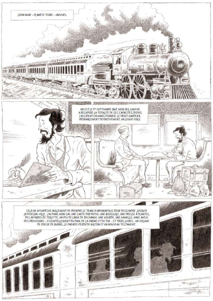 Tout au long de son périple, John Muir a tenu son journal. À travers ce récit à la première personne, on va découvrir cette nature qui l’émerveille. Cependant, s’il relate avec précision ce qu’il voit, il parle très peu de lui ; aussi le bédéiste va-t-il devoir combler les creux, ce qu’il fera à l’occasion des rencontres.
