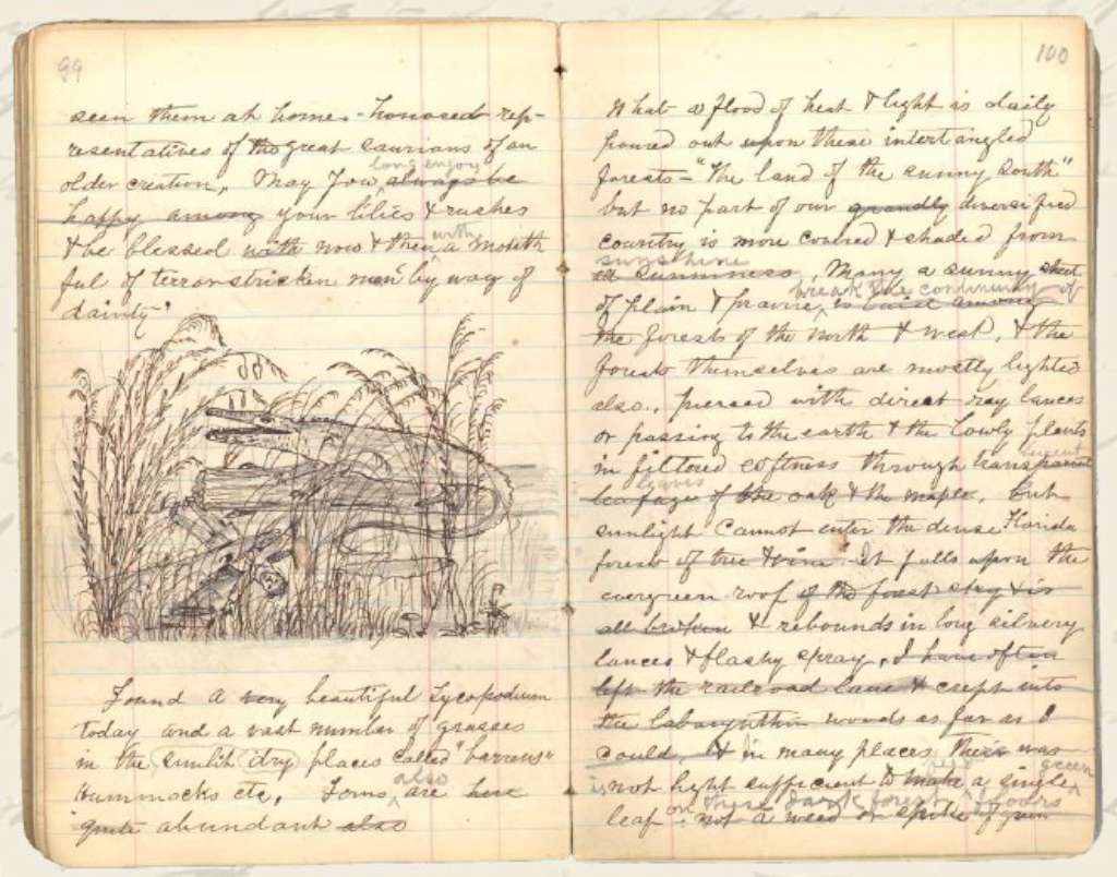 C’est à bord du train qui le conduit d’Indianapolis à Jefferson que John Muir qui a presque totalement recouvré la vue commence son journal : John Muir – Planète Terre – Univers, tels sont les mots inscrits sur la face intérieure de la couverture de son carnet. Avec un bagage fort sommaire contenant une loupe et sa presse botanique, le voilà parti plein sud pour un voyage à pied de quelques 1 500 km afin de réaliser son rêve : partir à la découverte de la nature à l’état sauvage.