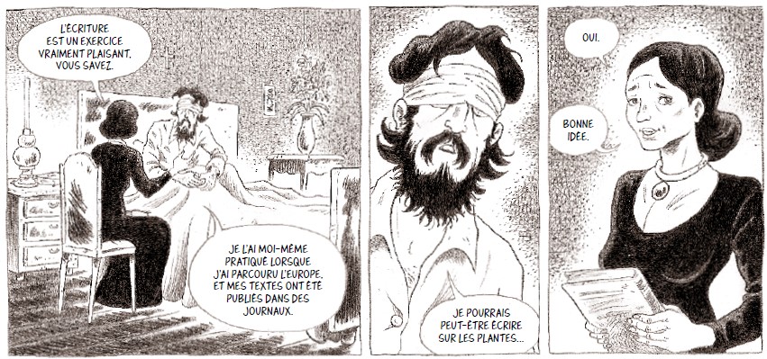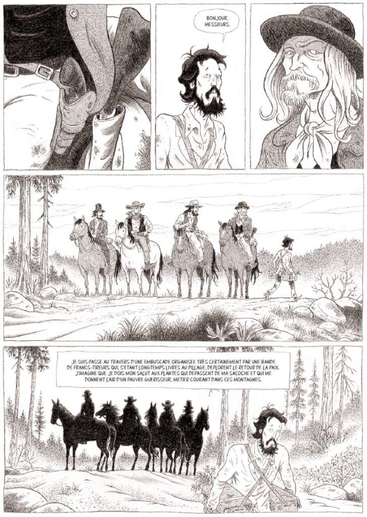 Comme le fermier qui disait que la nature était là pour nourrir et pas pour autre chose. Il y a aussi toutes ces flashbacks comme celui par exemple où il repense à sa tante et retourne en Écosse quand il était enfant. Ou encore, en fonction de ce qu’il voit ou vit, il s’échappe par la rêverie et se replonge dans le passé. Donc c’est toute cette narration qui est un peu complexe mais qu’on comprend très bien, qui est très fluide mais qui n’est pas linéaire que je trouve aussi intéressante.