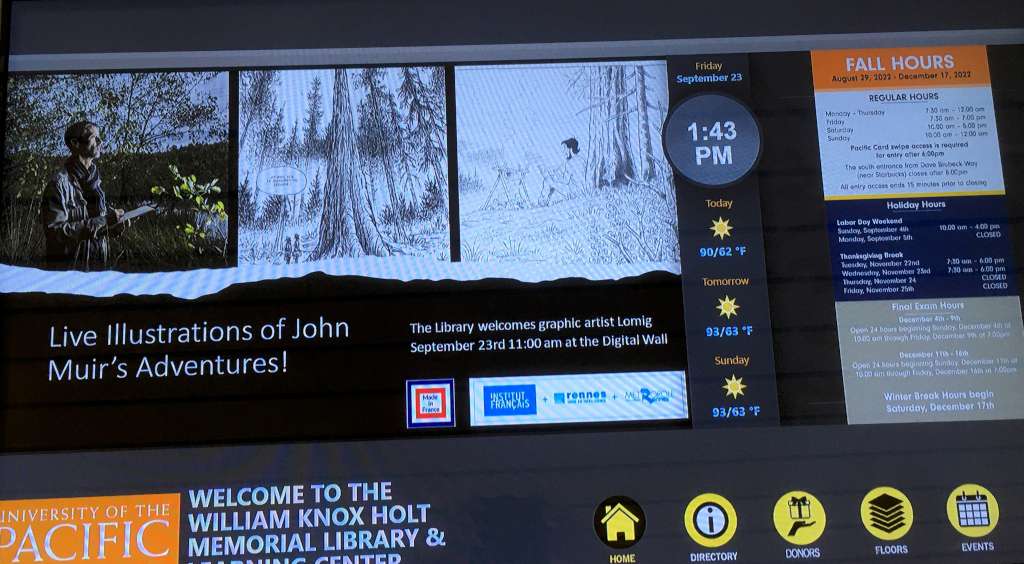 C’est par rapport à mon précédent album où j’ai adapté le roman de Jean Hegland. Donc c’était une merveilleuse rencontre avec Jean et après la sortie de l’album, elle m’a proposé de venir aux États-Unis parce qu’elle savait que je n’étais jamais allé en Californie passer quelque temps chez elle pour voir les décors que j’ai dessinés. Malheureusement il y a la Covid qui est arrivée par là, donc ça n’a pas été possible. Mais quand elle a su que je travaillais sur un nouveau projet et que la fin de l’histoire de John Muir se passe aussi en Californie, elle a renouvelé son invitation et là je n’ai pas pu refuser et j’y suis allé. Après, c’était un gros voyage ; il fallait trouver des moyens aussi pour le financer. Et donc, on a eu l’idée de créer «The Meeting into the forest ». C’était un rendez-vous ou une lecture dessinée où finalement elle lisait des extraits de son roman pendant que moi j’illustrais des petites séquences dessinées projetées sur un grand écran, tout ça dans une ambiance musicale et on a fait cinq représentations dans les grandes universités américaines.