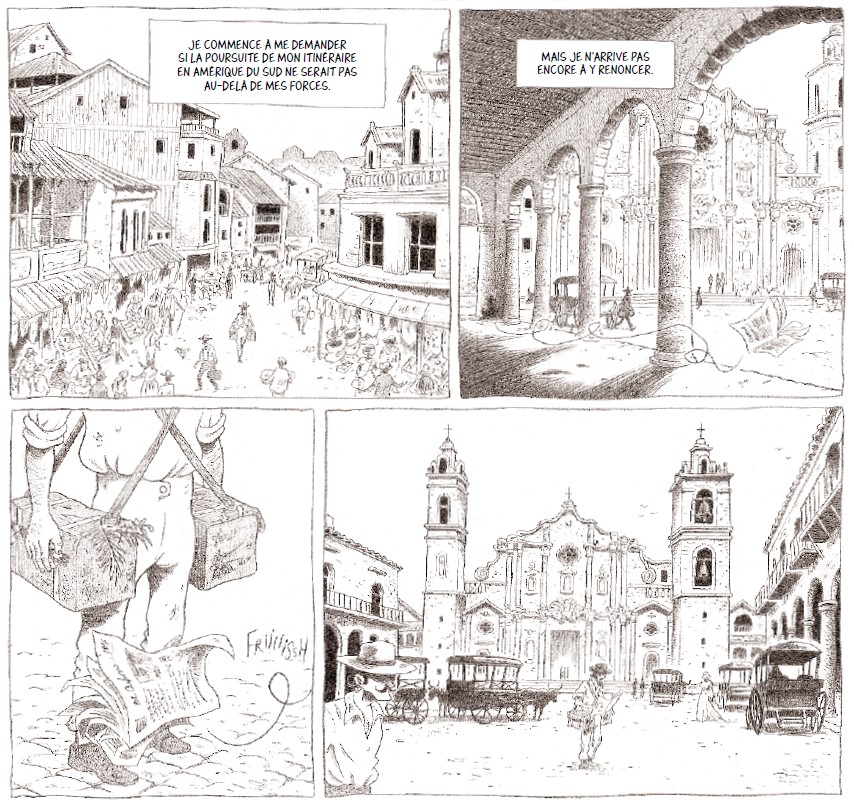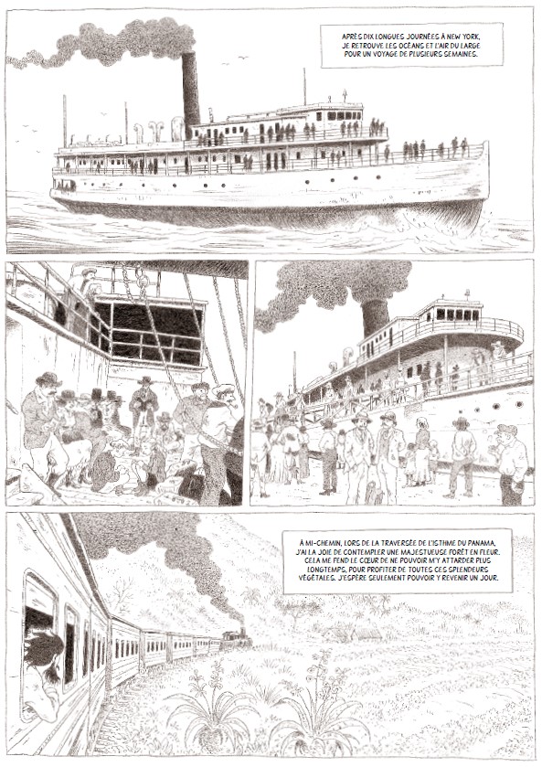 Ça a été. Effectivement, je n’étais pas tout à fait dans ma zone de confort qui est vraiment tout ce qui est la nature que je dessine un peu spontanément ; c’est assez limpide. Là, ça demande plus de travail et ça demande aussi de plus préparer donc à partir d’images parce qu’on ne peut pas faire n’importe quoi. C’est une bd qui se passe à une certaine époque. Même quand je dessine les villes – je pense à New York – il fallait faire vraiment attention à ce qui existe, ce qui n’existe pas à cette époque-là.