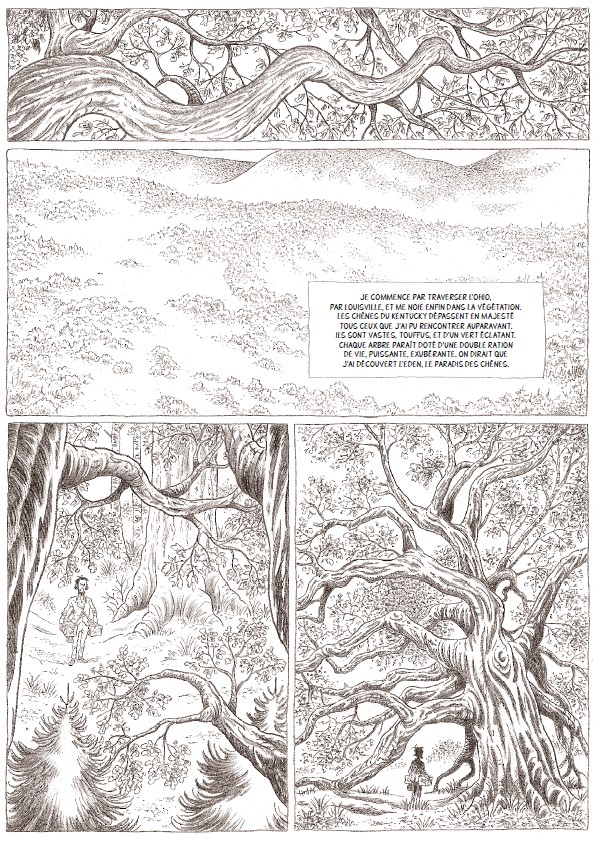 Vaste question. Mais c’est vrai que de pouvoir montrer à travers ses yeux cet état du Sud qui est dévasté par la guerre, c’était une chose, et aussi, comme je le disais tout à l’heure, cette connexion à la nature. Là, pour le coup, ce n’était pas au départ évident d’entrer dans les écrits de Muir. En fait, ce que j’ai pu voir, c’est le journal de bord qui parle très peu de lui. Il raconte ce qu’il voit. Il est émerveillé de toutes les nouvelles plantes qu’il découvre. Il parle très peu de lui, il parle très peu des rencontres. Donc moi, c’est vraiment cet aspect que j’ai romancé en quelque sorte, c’est-à-dire donner vie un petit peu à ces personnages. Et aussi en traduisant un peu ses correspondances avec Catharine Merrill dont vous venez de parler mais aussi avec ses amis ou des membres de sa famille, j’ai compris un petit peu tout ce qui se passait dans sa tête. Donc il y a cet espace un peu spirituel que j’ai dû développer et puis profiter de chaque rencontre avec les différents protagonistes pour expliquer ce qu’étaient les États-Unis à cette époque et comment les gens percevaient la relation qu’ils avaient avec la nature. Et là on voit à quel point il était en décalage ; en fait c’est comme s’il pensait un peu plus comme nous, même s’il se posait beaucoup de questions à savoir comment on prend soin de la nature mais à cette époque-là, il faut bien comprendre que les gens voyaient la nature comme un espace inépuisable où on peut couper tous les arbres, exploiter n’importe quel champ, qu’il y en avait à perte de vue et que ce n’était pas un problème.