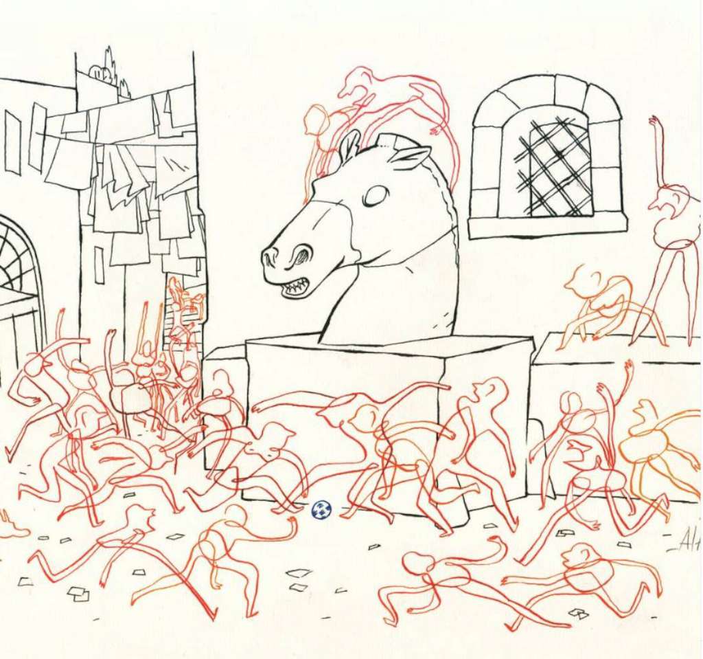 Il y a un dessin par exemple qui a servi pour l’affiche de cette exposition qui se passe à Venise. Un personnage sur une barque qui va cueillir une pomme accrochée à la branche d’un arbre qui dépasse d’un muret. ça c’est un dessin qu’il m’est impossible de vendre parce que c’est le premier que j’ai fait quand je me suis installé à Venise il y a 15 ans. C’est le canal qui passait derrière chez nous, celui-ci c’est un marqueur important pour moi quand je revois ce dessin je me revois sur place en train de le faire…