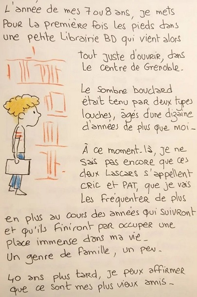 Momie Folie, je les connais depuis l’ouverture, il y a 40 ans. Moi j’en avais 8. Ma mère m’a emmené dans cette librairie qui était juste à côté. J’y ai acheté ma première BD un « Léonard » et depuis je n’ai jamais arrêté d’avoir un lien fort avec ces deux gars-là, Cric et Pat, et puis on est 40 ans plus tard et c’est ma famille en fait ! Je ne vis plus à Grenoble depuis longtemps, en revanche j’ai besoin régulièrement de venir leur rendre une visite où qu’ils soient, d’ailleurs.