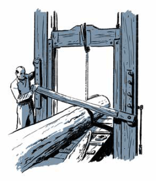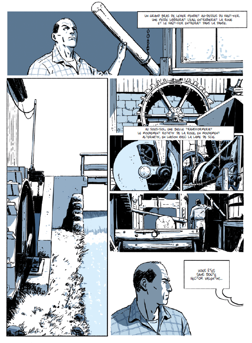« Le système sur lequel était monté la grande lame verticale ressemblait à une guillotine, voilà ce qu’on appelait le Haut-Fer. Un grand bras de levier pendait au-dessus du Haut-Fer. Une pesée libérerait l’eau, entraînerait la roue et la roue et le Haut-Fer entrerait dans la danse.«